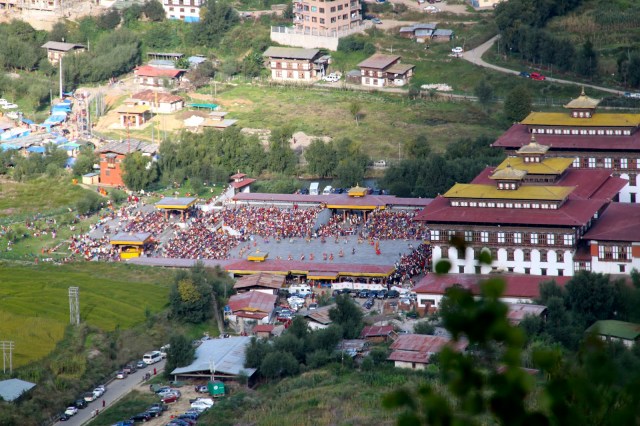 Far below we can see the Tashichhodzong courtyard where the festival is still going on. The festival lasts from about 9 am to 5 pm. We can hear some of the sounds of the drumbeats and cymbals.