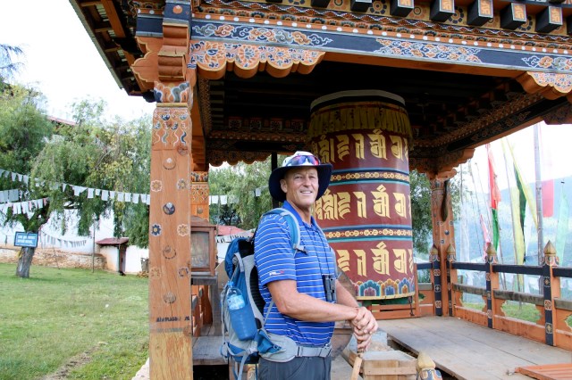You must cover your shoulders and legs and must remove your shoes before entering a temple. No shorts are allowed and you might need a collared shirt to get into some of the temples. You are not allowed to take photos inside of temples. We follow Tashi and spin the prayer wheels as we enter the temple. Once inside we try to follow Tashi’s lead and we show respect by using hands clasped in front in prayer position and follow Tashi as he touches his hands multiple points on chest and head and then kneels and touches his forehead to the ground. The statue of the Buddha in front of us must be 15 feet tall and covered in gold. We follow Tashi’s lead and make small cash offer and the monk pours holy water into our hands. Tashi sips the holy water from his hands (we don’t) and sprinkles the rest over his head.