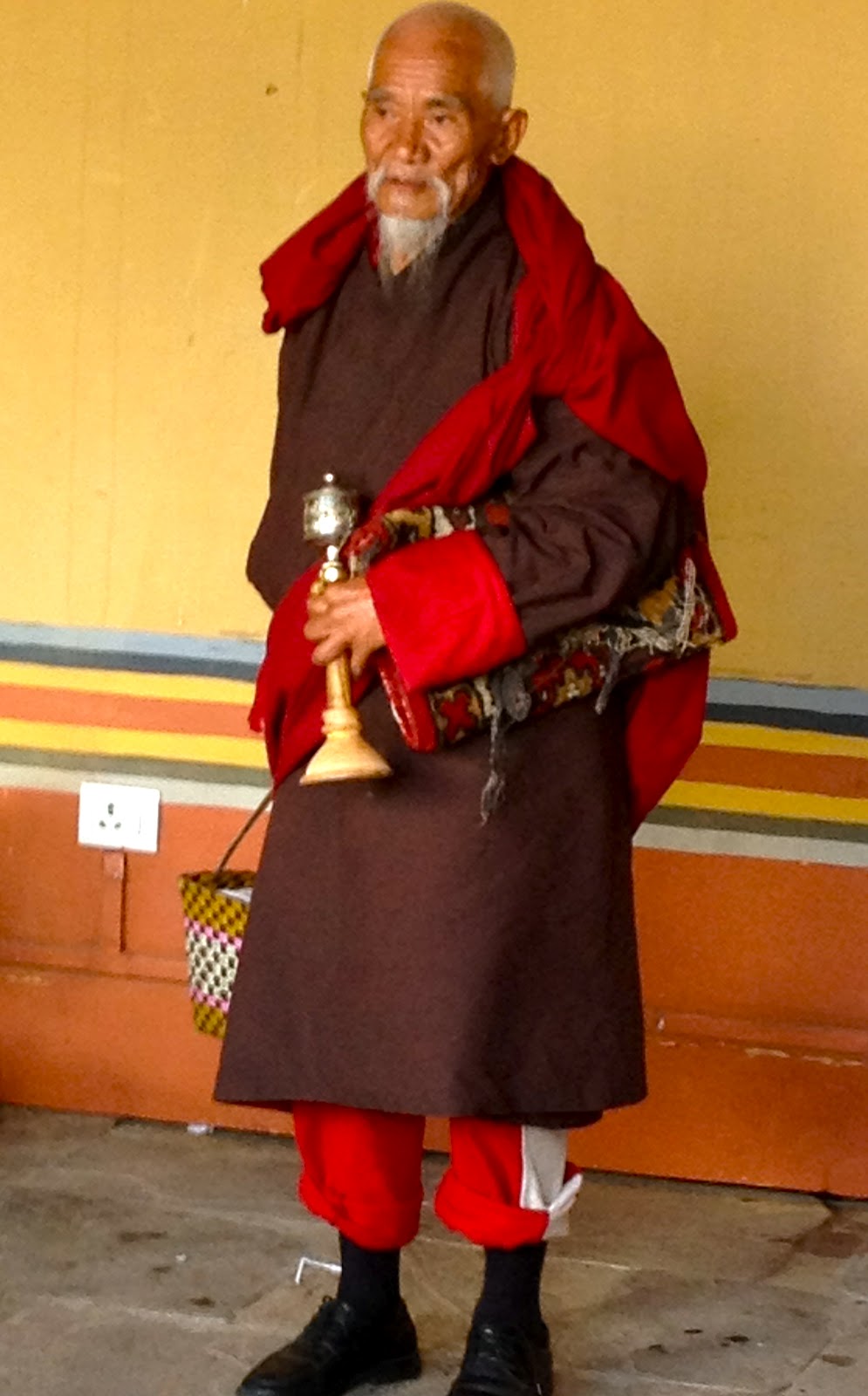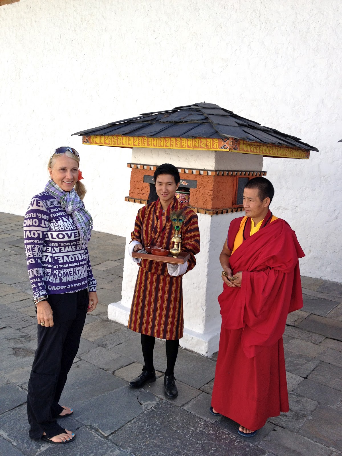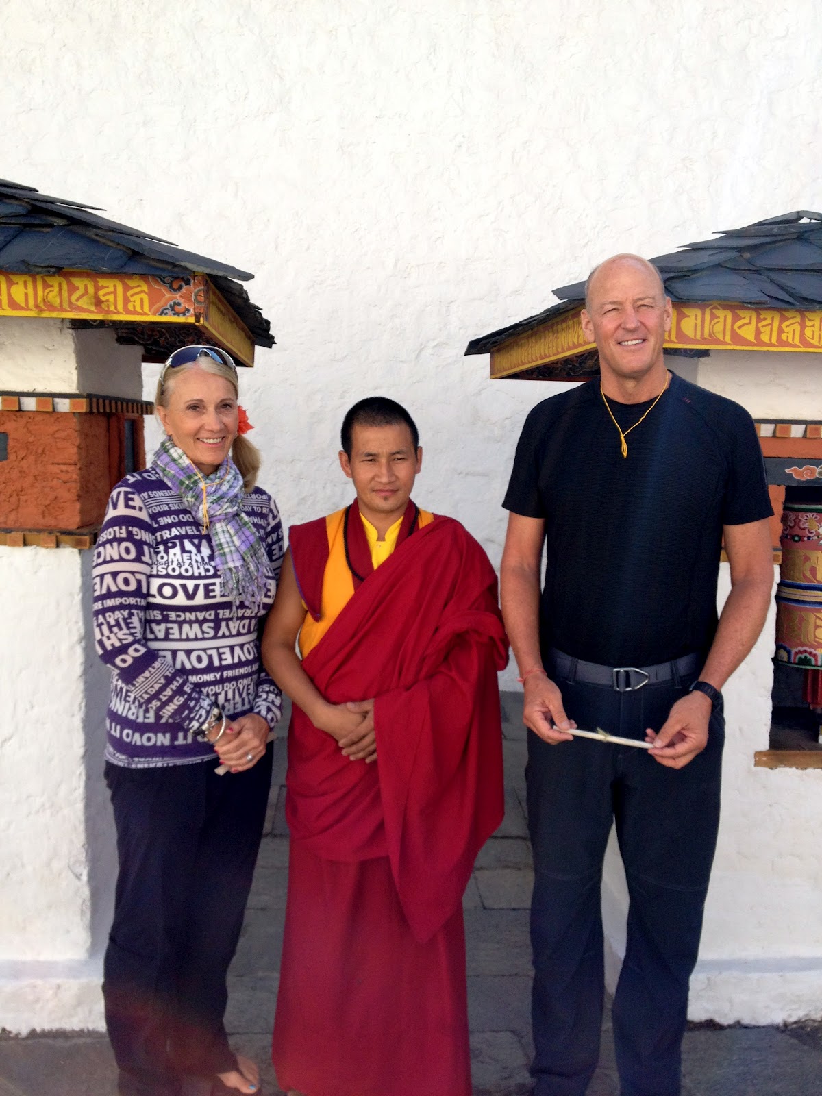 A prayer was said by the Lama, then he blessed us with holy water, and then put a yellow string around our neck. The roads in Bhutan or so narrow and dangerous that we needed the blessing! |