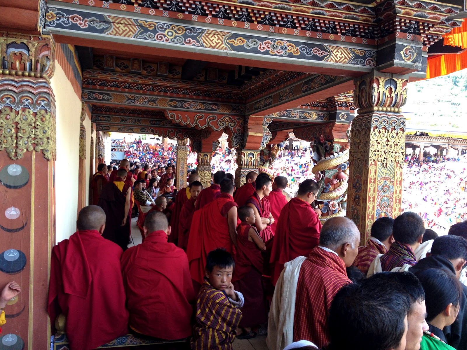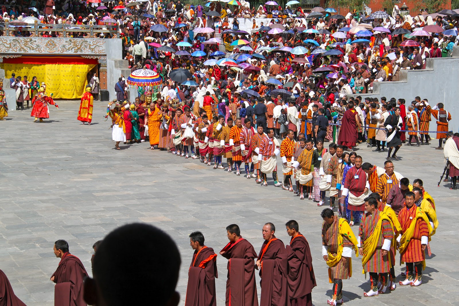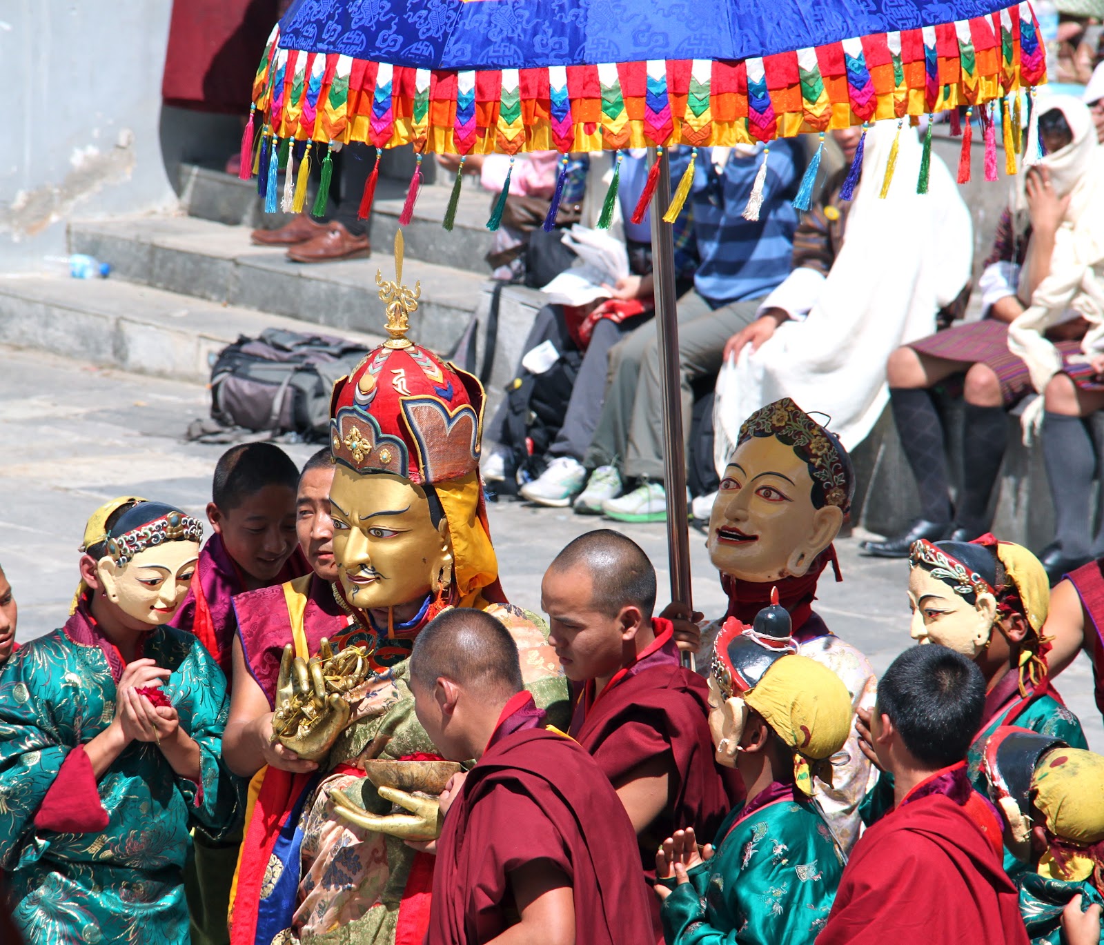 threincarnation of the Guru Rimpoche into the square and up the stairs next to us in front of the tent with all of the monks.