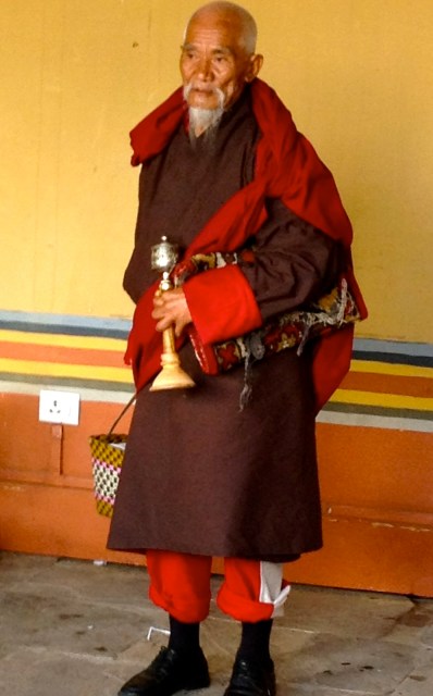 You must cover your shoulders and legs and must remove your shoes before entering a temple. No shorts are allowed and you might need a collared shirt to get into some of the temples. You are not allowed to take photos inside of temples. We follow Tashi and spin the prayer wheels as we enter the temple. Once inside we try to follow Tashi’s lead and we show respect by using hands clasped in front in prayer position and follow Tashi as he touches his hands multiple points on chest and head and then kneels and touches his forehead to the ground. The statue of the Buddha in front of us must be 15 feet tall and covered in gold. We follow Tashi’s lead and make small cash offer and the monk pours holy water into our hands. Tashi sips the holy water from his hands (we don’t) and sprinkles the rest over his head.