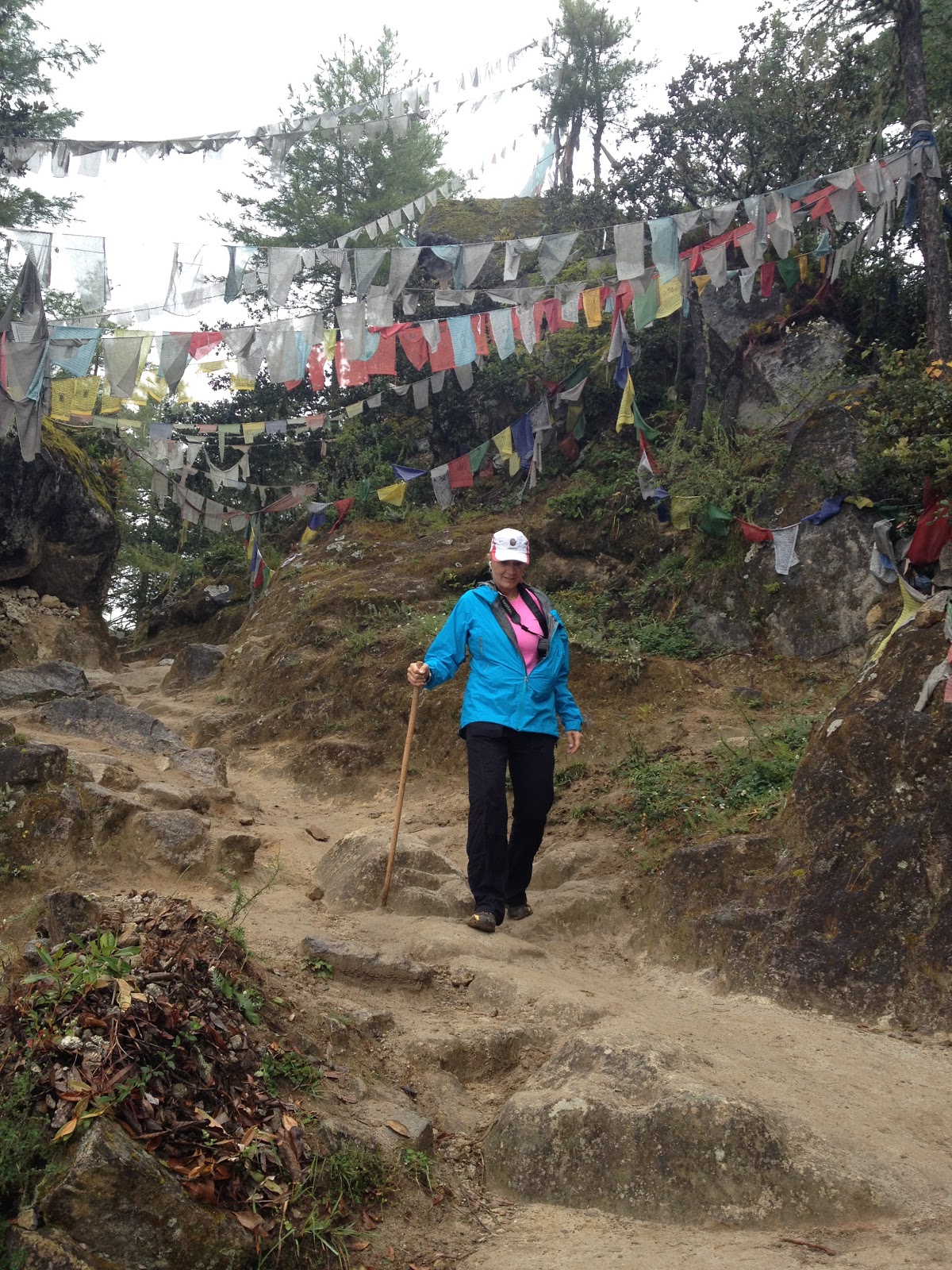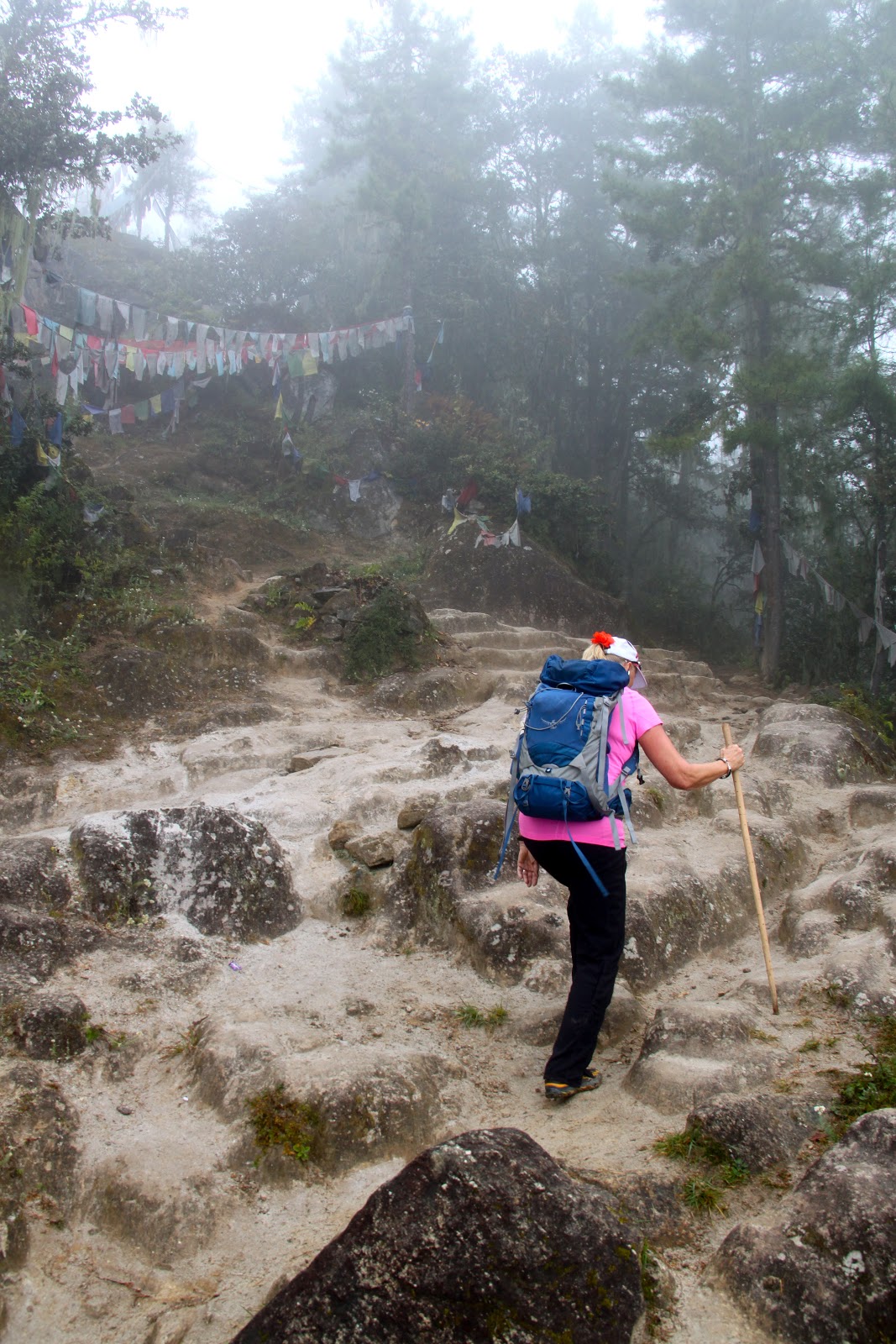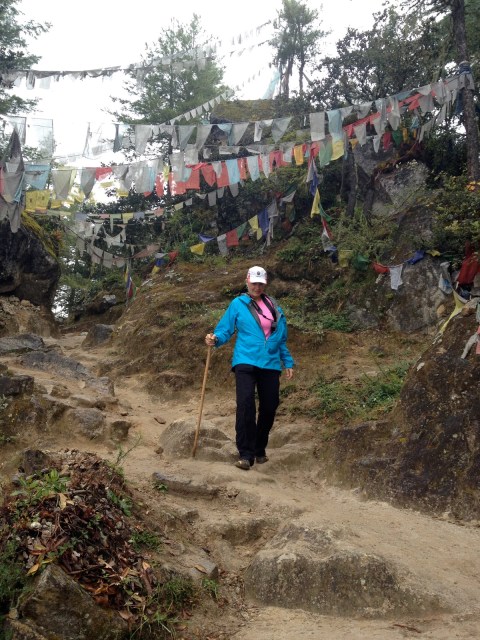 | At times, you might think we were hiking in Oregon! The prayer flags brought us back to reality. |