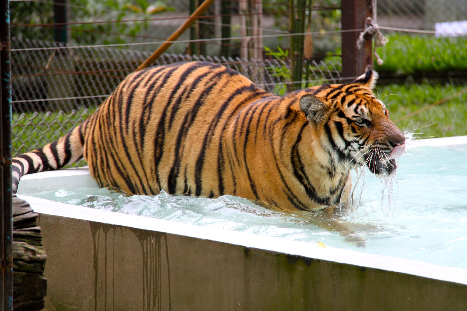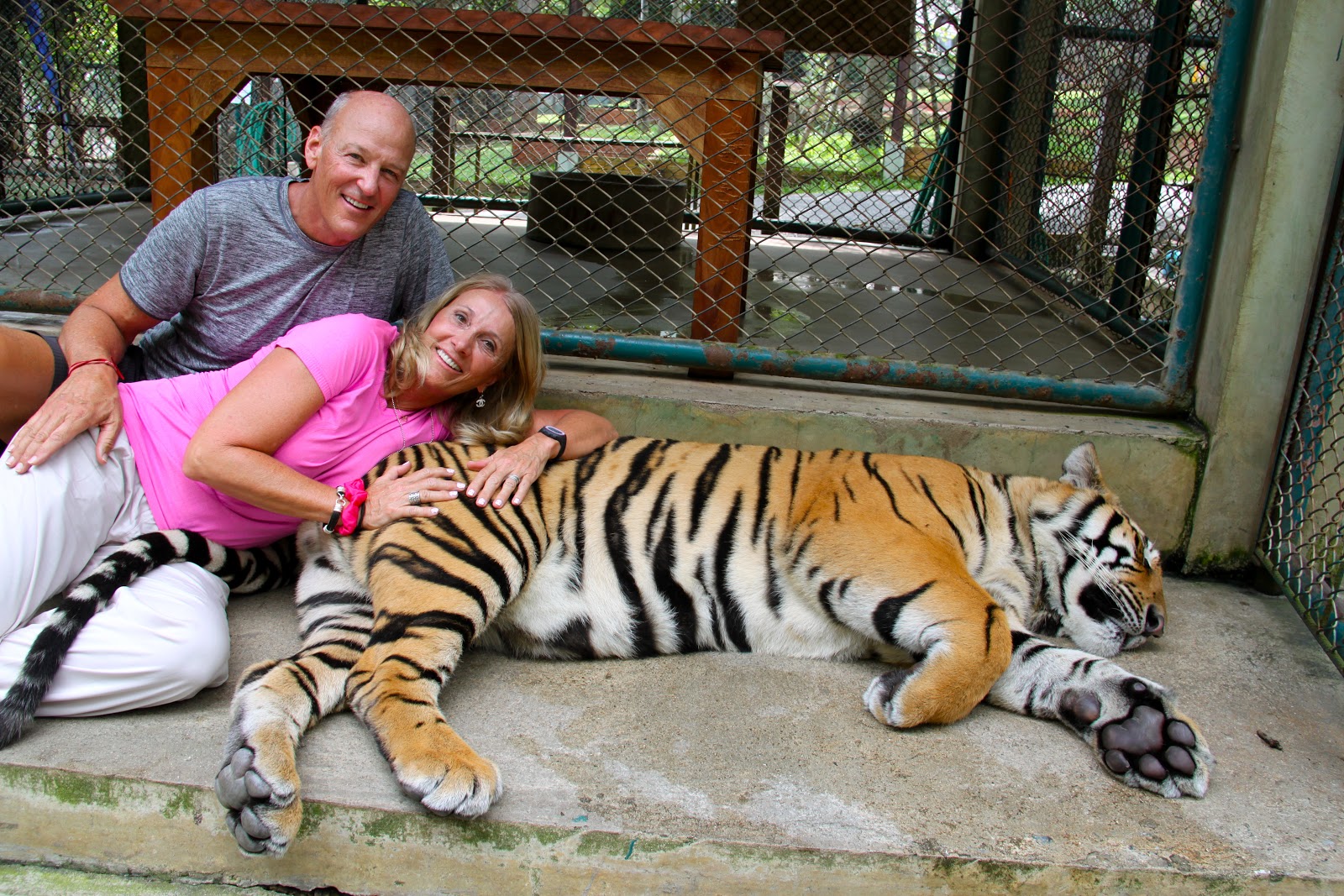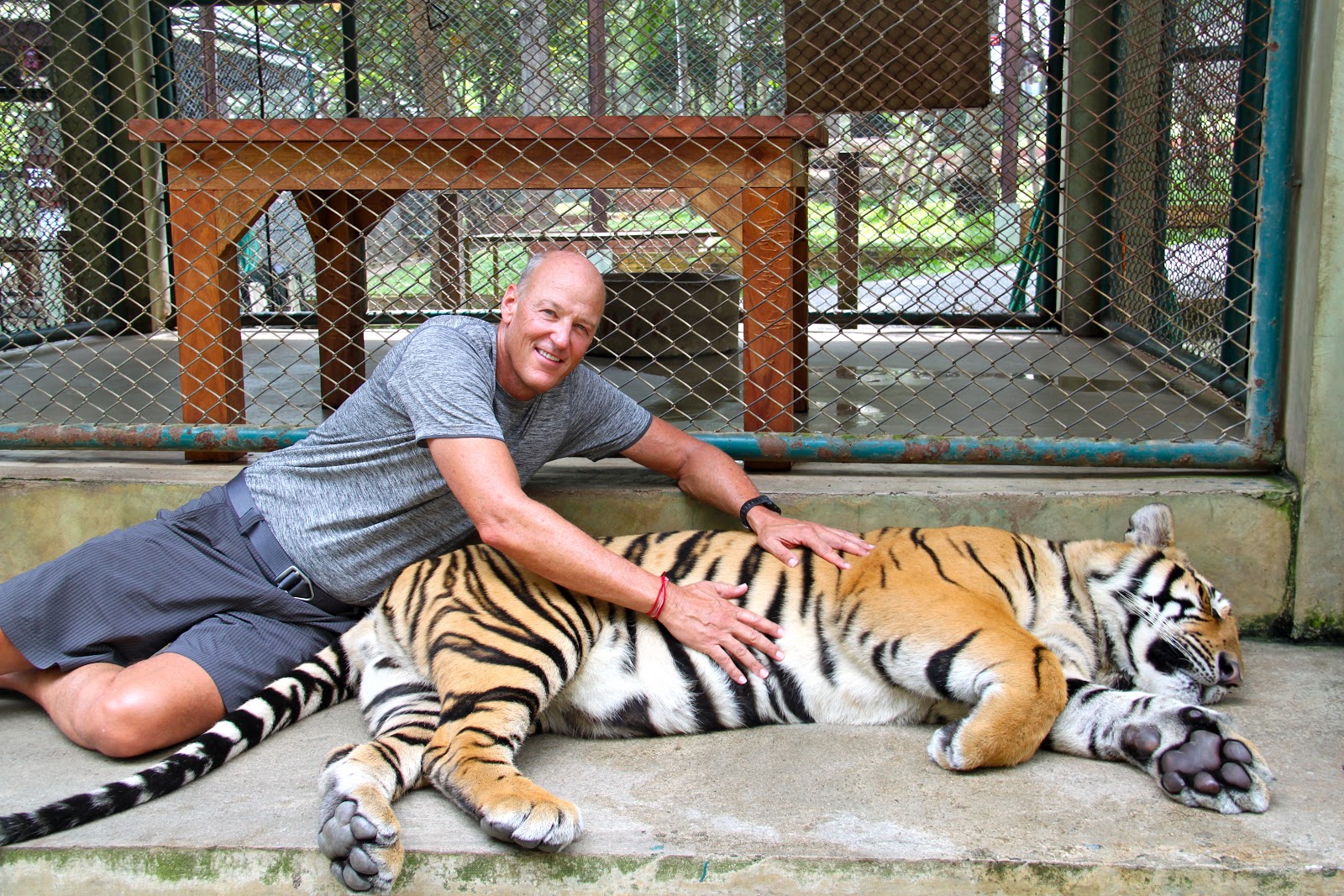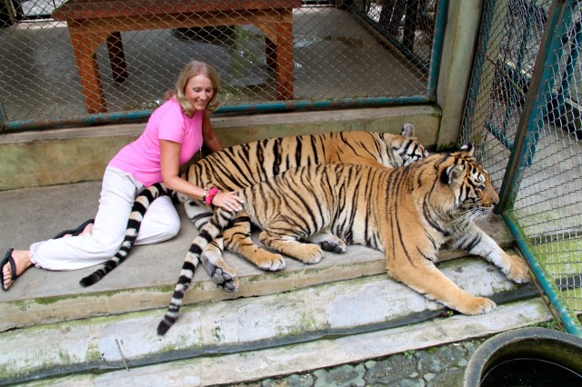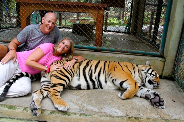 OK. We know this is crazy dangerous for us and not good for the Tigers but it was fun. We got into the Tiger enclosure north of Chiang Mai after watching others survive the experience. We were instructed to approach them from behind. If you approach them from the front they think that you want to play and they play rough.