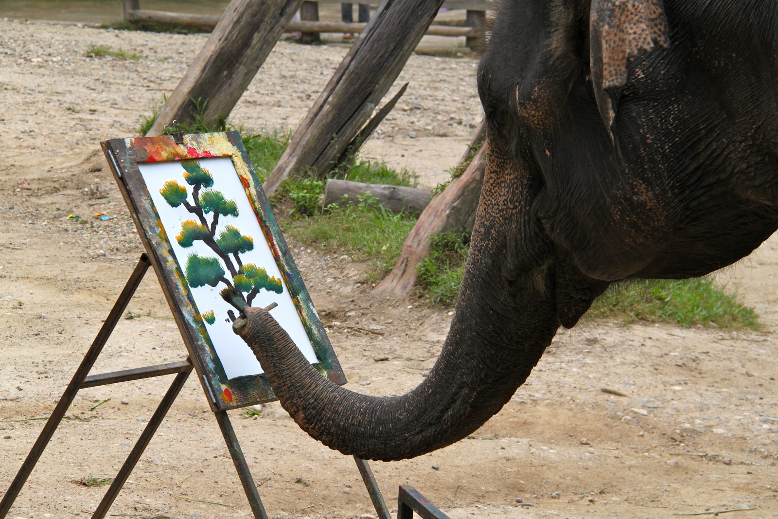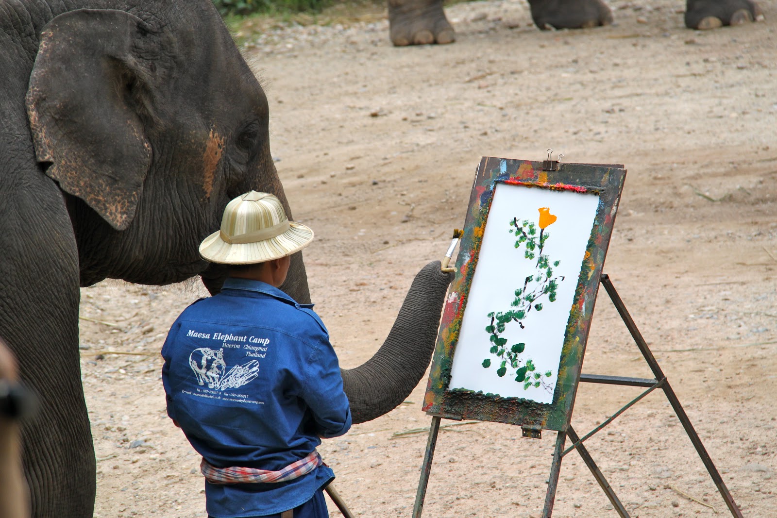 | Five different elephants painted 5 different pictures. The Mahut (trainer) dips the brush in a color and hands the brush to the elephant in his trunk. |