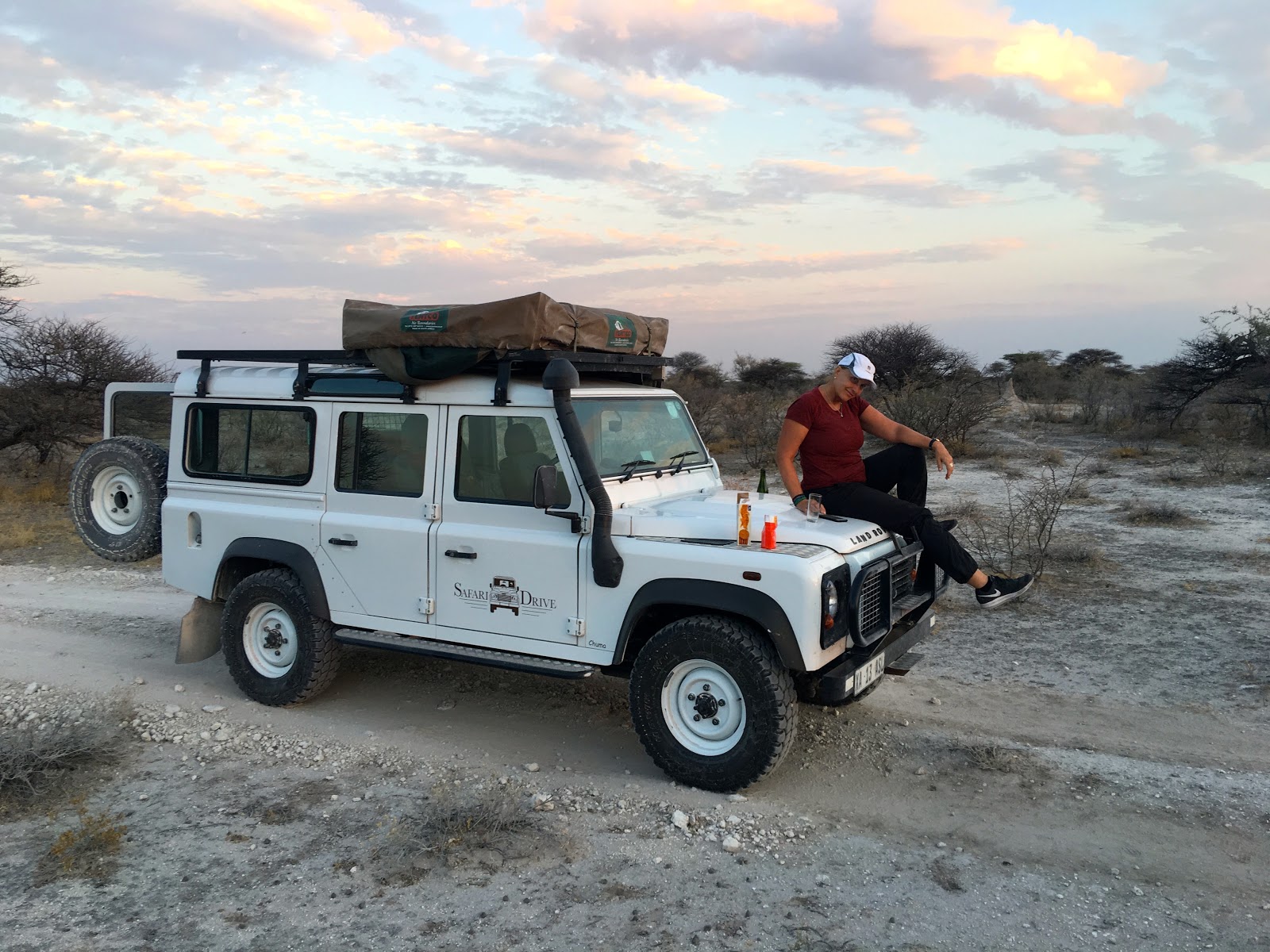 On the way back to our camp we stopped outside the park for a sundowner toast. We pulled our Land Rover off the road and got into our cooler and found drinks and snacks. We sat on the hood and watched the sun go down.