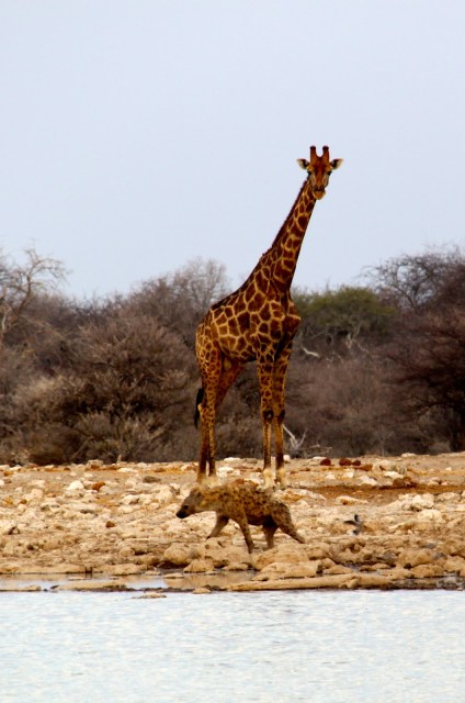 The Giraffe is skittish. He waits at a distance for the Elephants to leave. He also waits for the Zebras to leave. He doesn’t even trust the Impalas to be around when he has to bend down with his neck and squat with his legs to get a drink. He is very vulnerable to attack when he is in the position and he wants to be sure that nothing will hurt him while he is getting a drink.