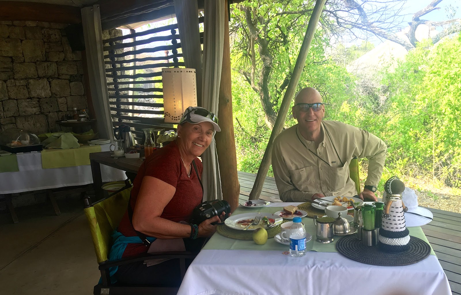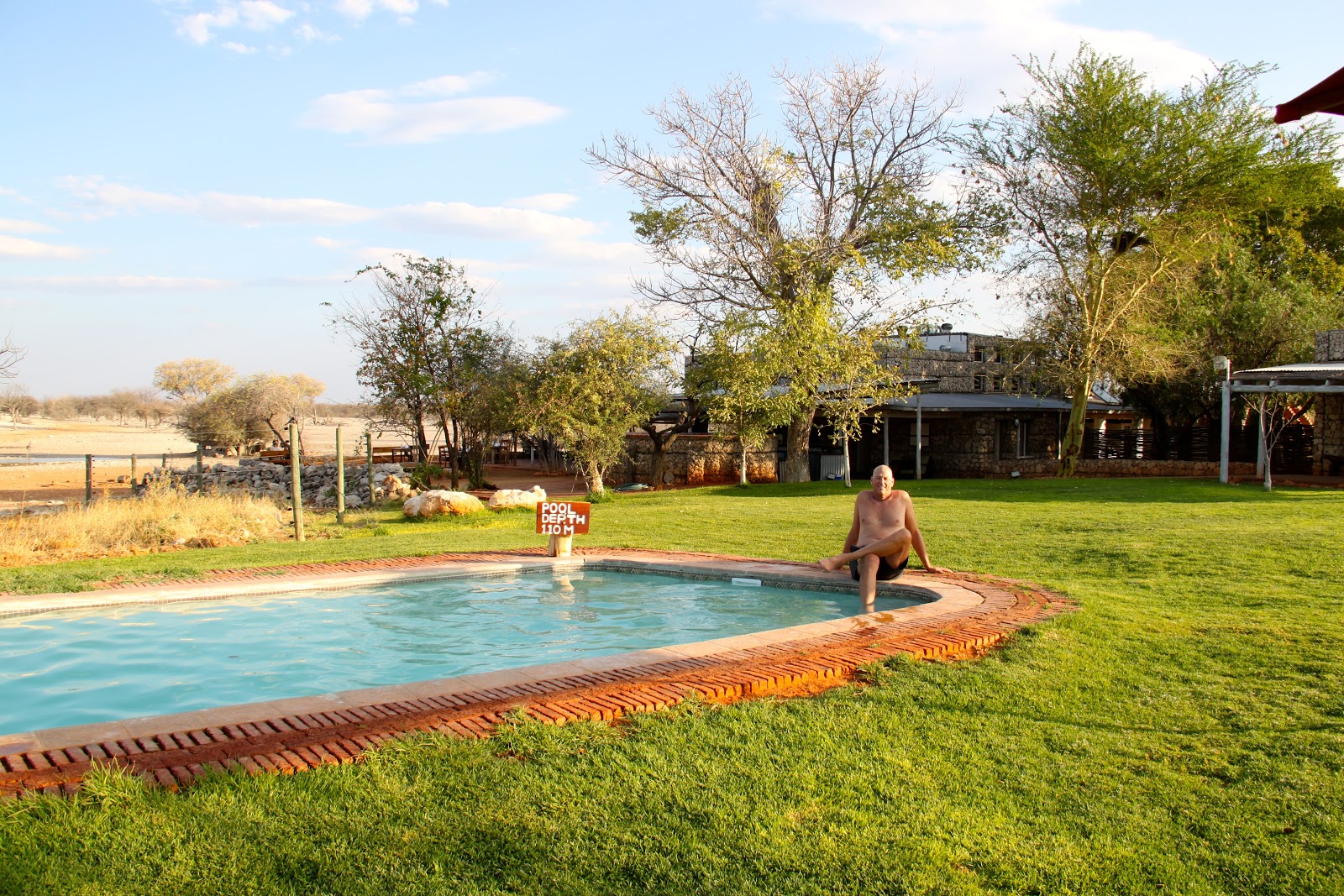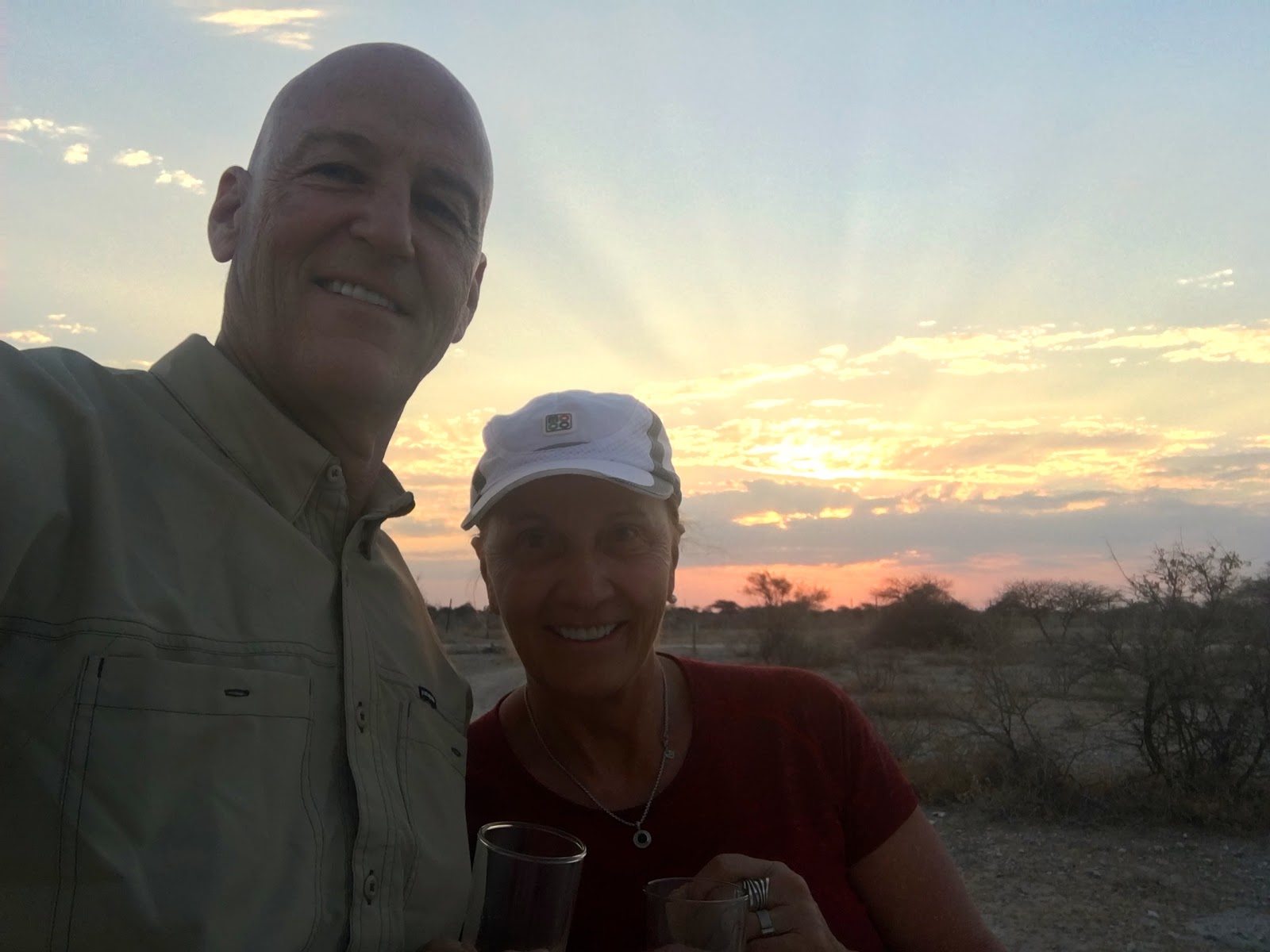 That night we stayed in Andersson’s Camp. Charles Andersson “discovered” this area in 1851 and this camp is on that homestead. The camp has a “blind” or “hide” where you can walk in an underground tunnel up to a concrete bunker with one foot wide windows with metal bars so you can look at the animals up close. When Barb and I entered the blind there were three people in it looking at a young male Lion from a distance of about 5 feet. The Lion was crouched looking straight into our faces. All of sudden the Lion roared and charged forward stopping just short of the bars. Everyone in the blind jumped back from the bars. This was gut wrenching scary! The Lion charged again and stopped, this time throwing dirt into the blind through the bars. One lady was shaken and left the tunnel. The Lion charged 3 or 4 more times before he got up to leave following a family of three other female Lions as they left the area. Wow! They tell you if you are charged by a Lion to stand your ground and yell back at the Lion. I’m not sure I could stand my ground in the face of that power and noise of the Lion’s roar.