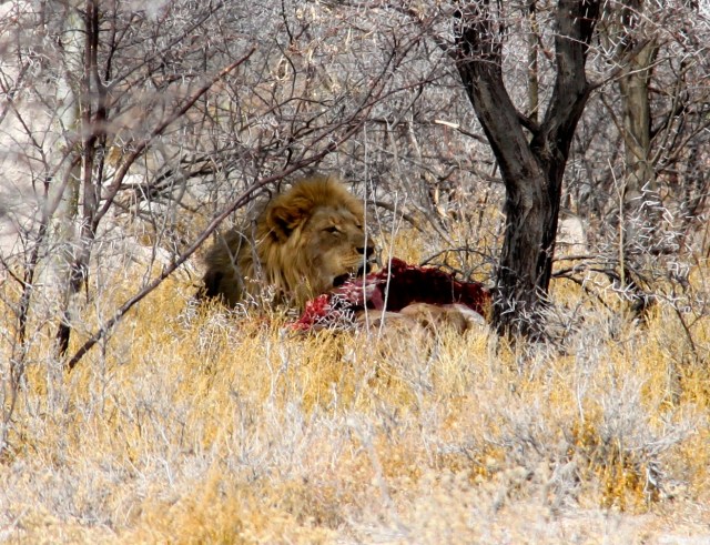 In the morning as we drove out we saw about five Black Backed Jackals. Then we spotted a big male Lion under a tree eating an Eland. No doubt the female Lions killed the Eland and the big male Lion in his role as the King of the Jungle gets to eat first.
