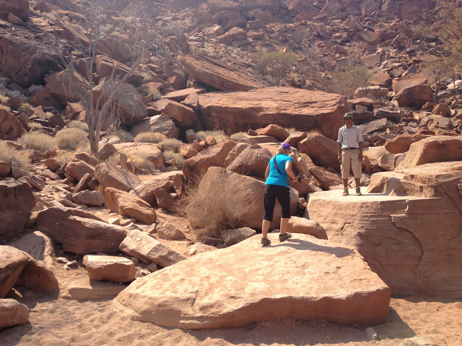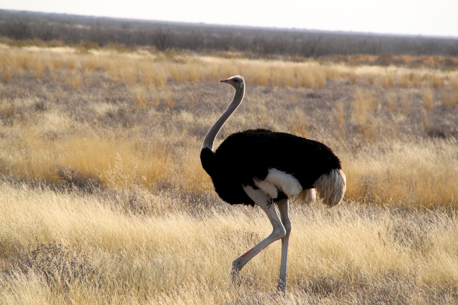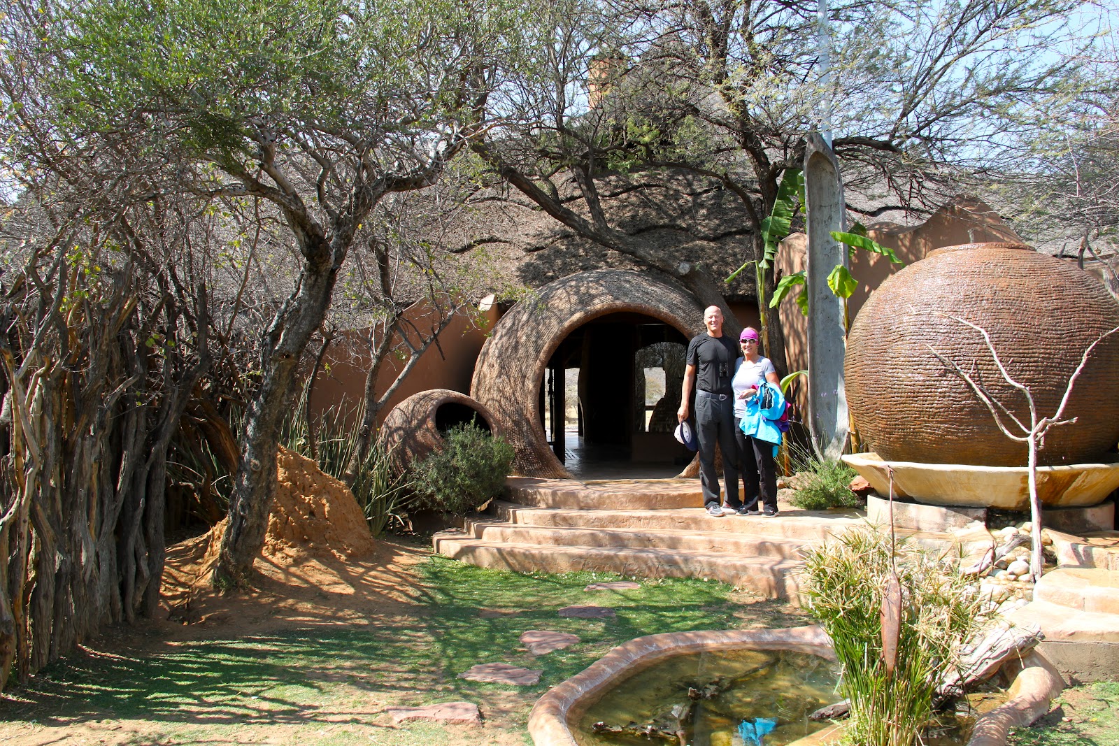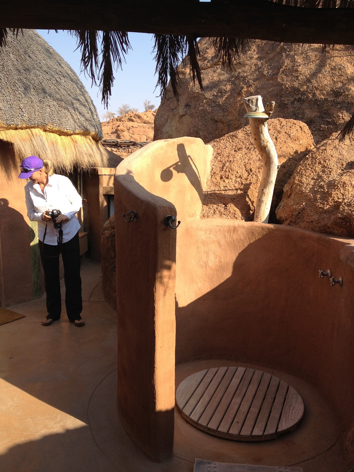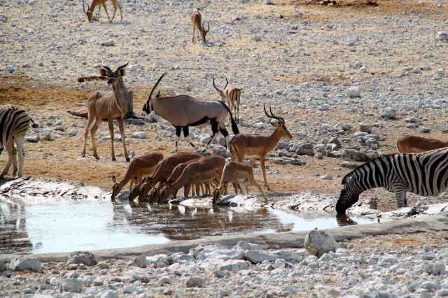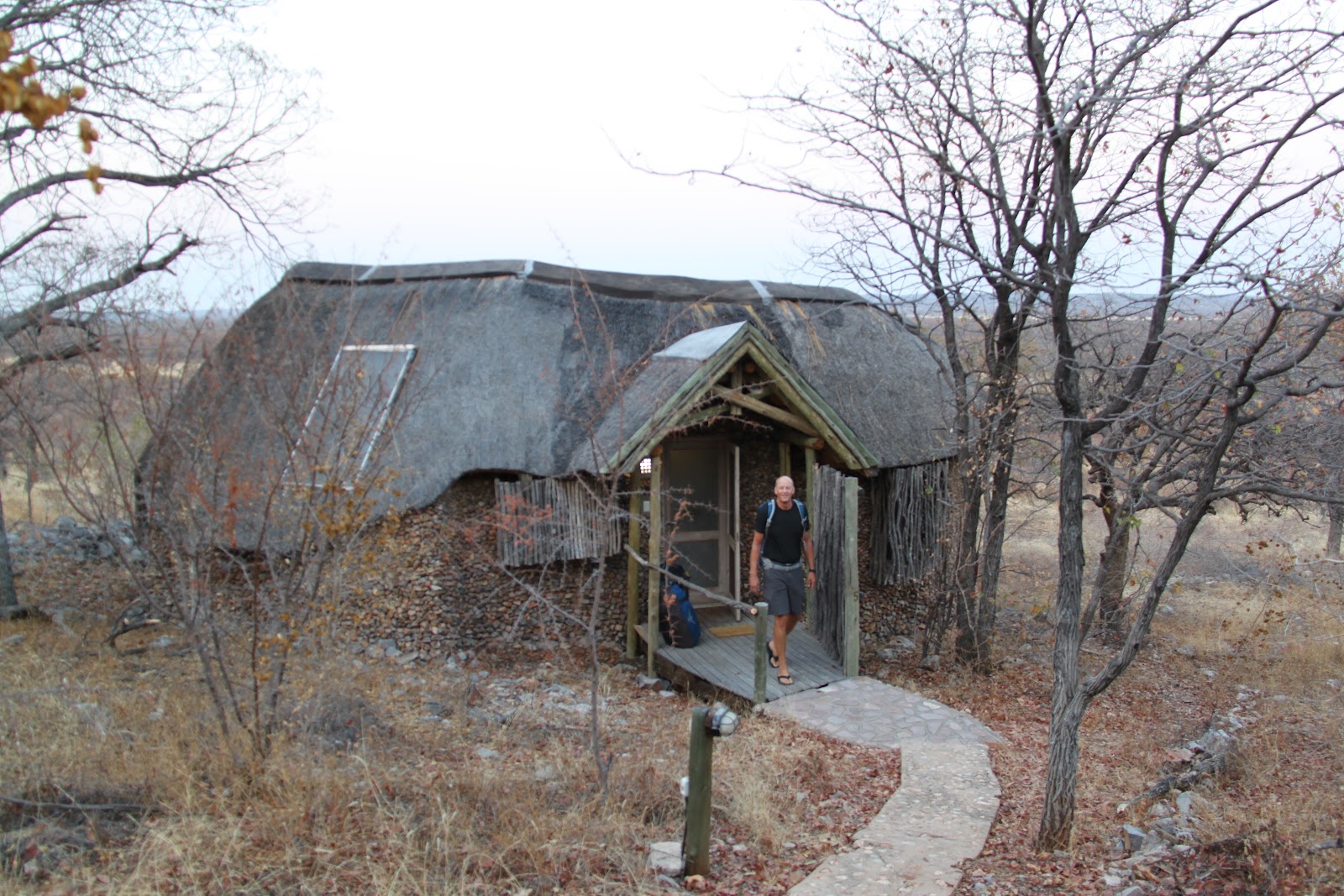 With a 6 am wake-up (a knock on your rock and thatched roof hut, as there are no phones or Internet), we are out to Etosha National Park. This morning we are going with a guide. Our guide drove 20 minutes to the park entrance and through the gate and immediately turned off the main road onto dirt roads. We noticed most vehicles were going a different direction. For the first hour there seems to be fewer animals than were outside our Ongava hut. But soon we saw 4 lazy lionesses. Then we saw springbok, oryx, and a solitary spotted hyena. It is very unusual to see a solitary hyena. They travel and hunt in packs. Then we saw springbok, male ostrich (their brains are smaller than one of their eyes) and herds of zebra, giraffe, wildebeest (a.k.a. gnu), kory bustard (a very large bird), a black faced impala (endemic to Namibia), kudu, hartebeest, warthog, and elephant. There are thousands of animals in Etosha. There are water holes in Etosha and animals migrate to the water.