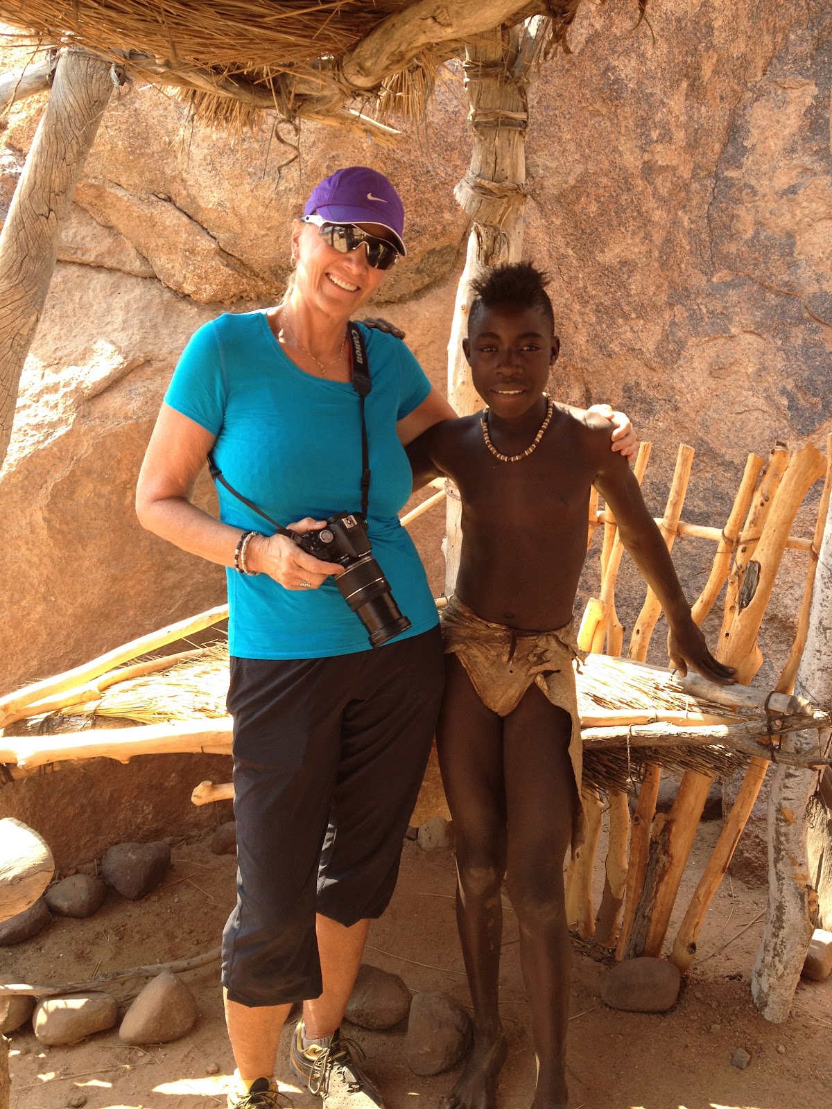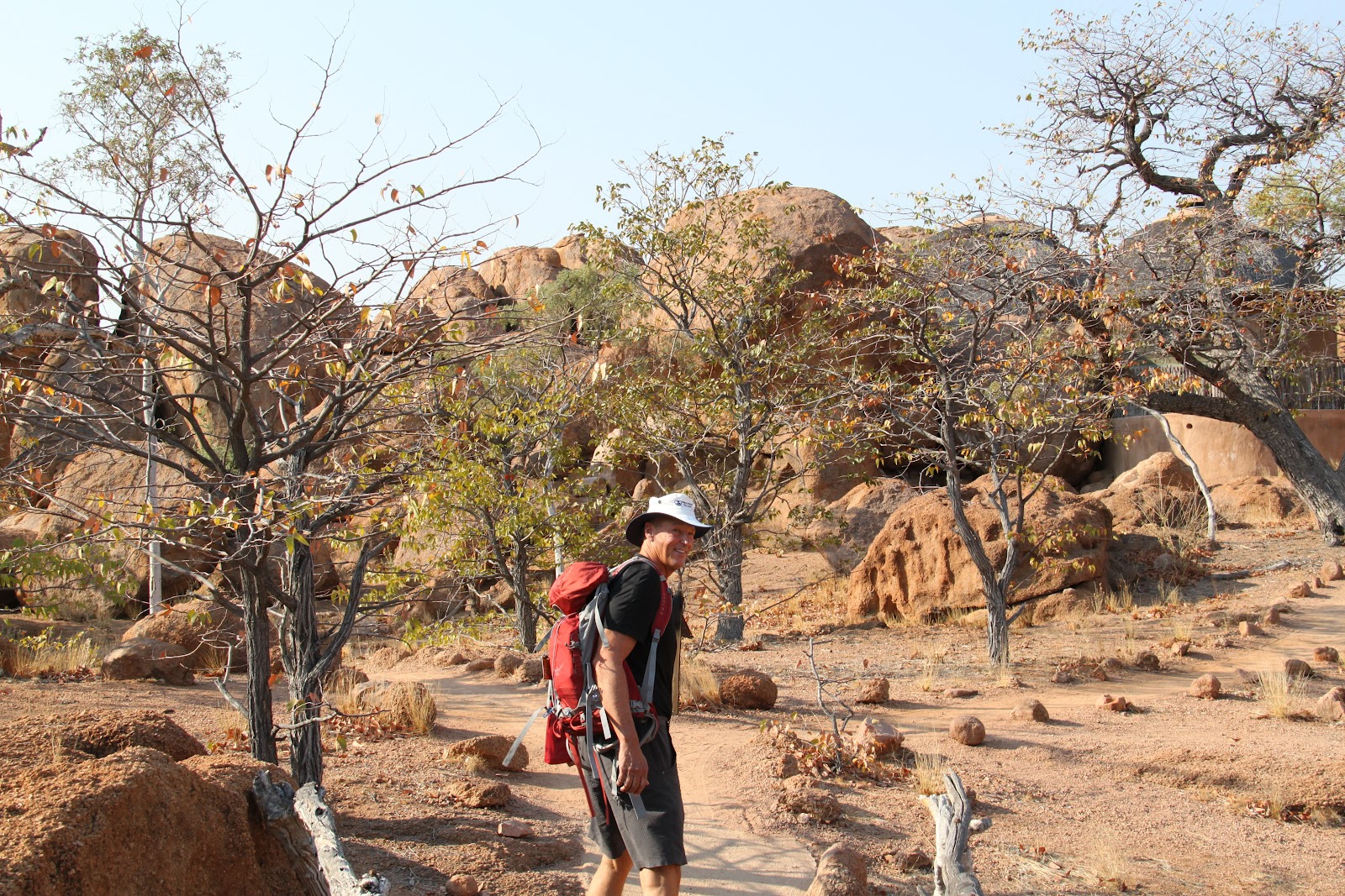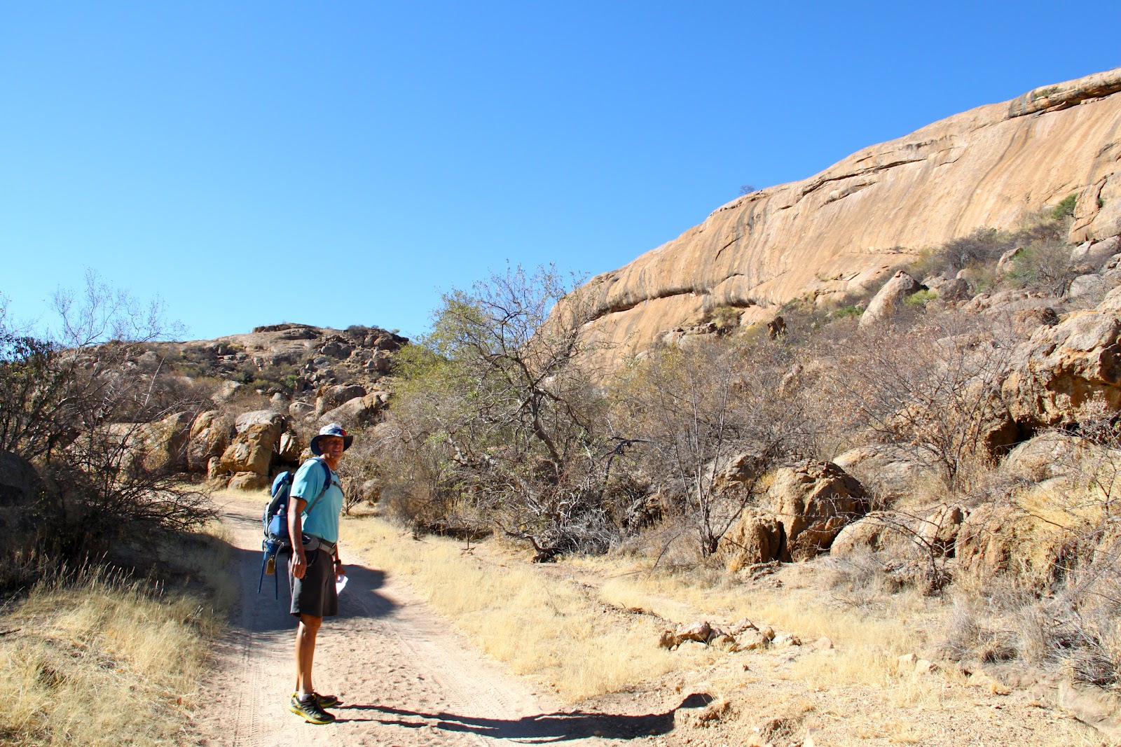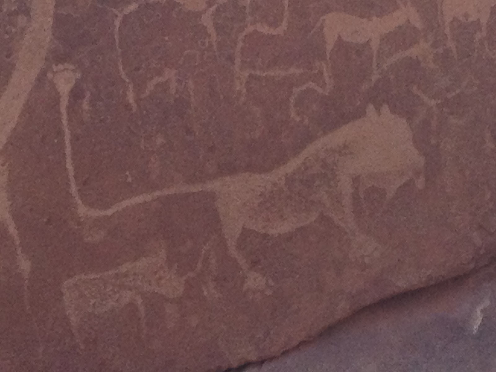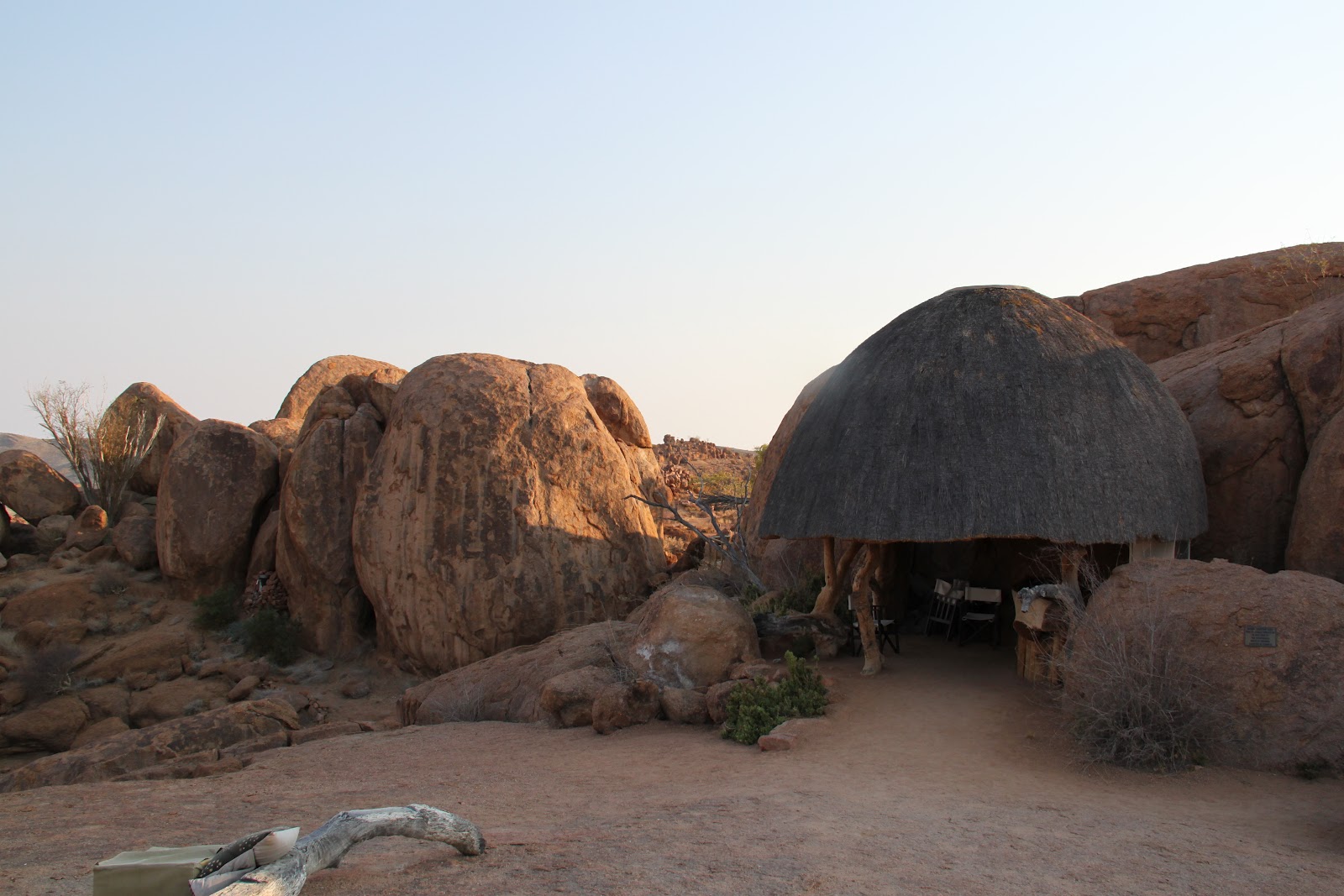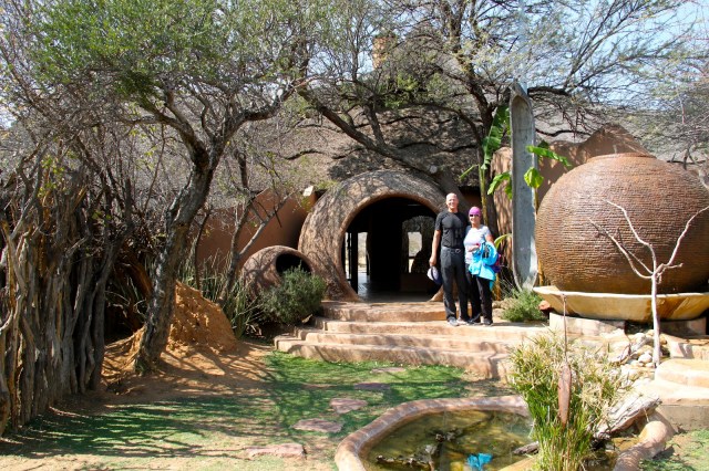 With a 6 am wake-up (a knock on your rock and thatched roof hut, as there are no phones or Internet), we are out to Etosha National Park. This morning we are going with a guide. Our guide drove 20 minutes to the park entrance and through the gate and immediately turned off the main road onto dirt roads. We noticed most vehicles were going a different direction. For the first hour there seems to be fewer animals than were outside our Ongava hut. But soon we saw 4 lazy lionesses. Then we saw springbok, oryx, and a solitary spotted hyena. It is very unusual to see a solitary hyena. They travel and hunt in packs. Then we saw springbok, male ostrich (their brains are smaller than one of their eyes) and herds of zebra, giraffe, wildebeest (a.k.a. gnu), kory bustard (a very large bird), a black faced impala (endemic to Namibia), kudu, hartebeest, warthog, and elephant. There are thousands of animals in Etosha. There are water holes in Etosha and animals migrate to the water.