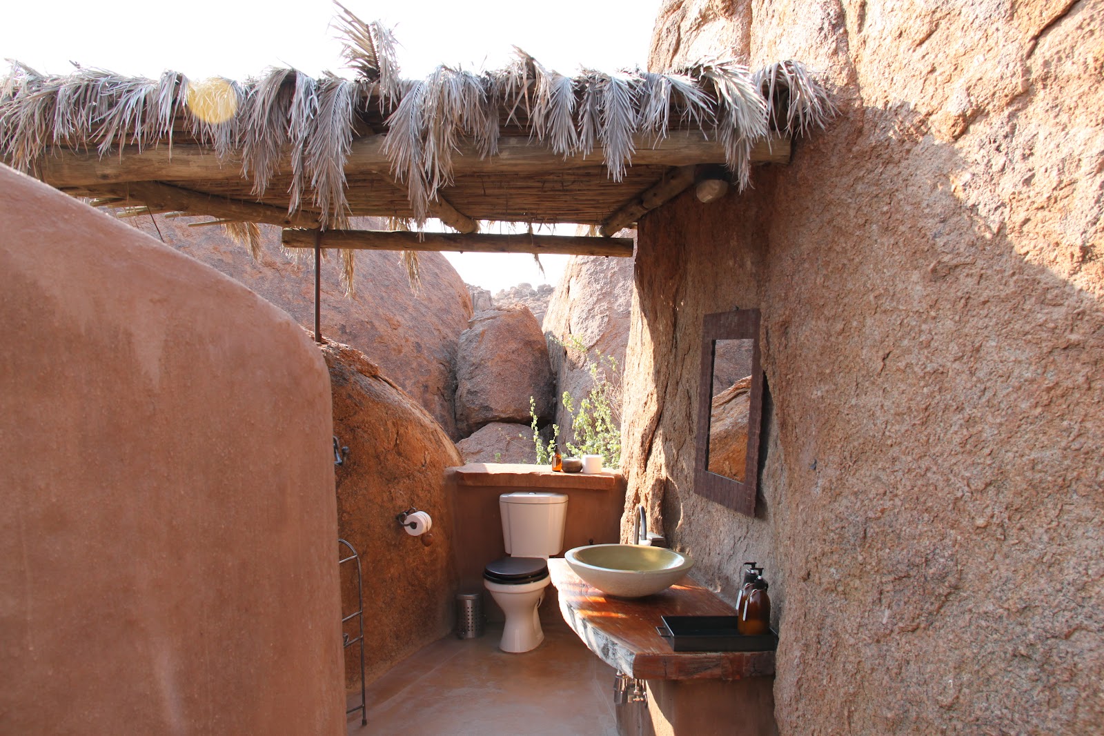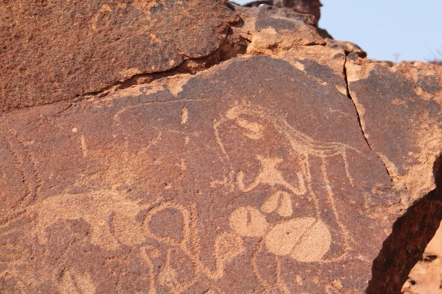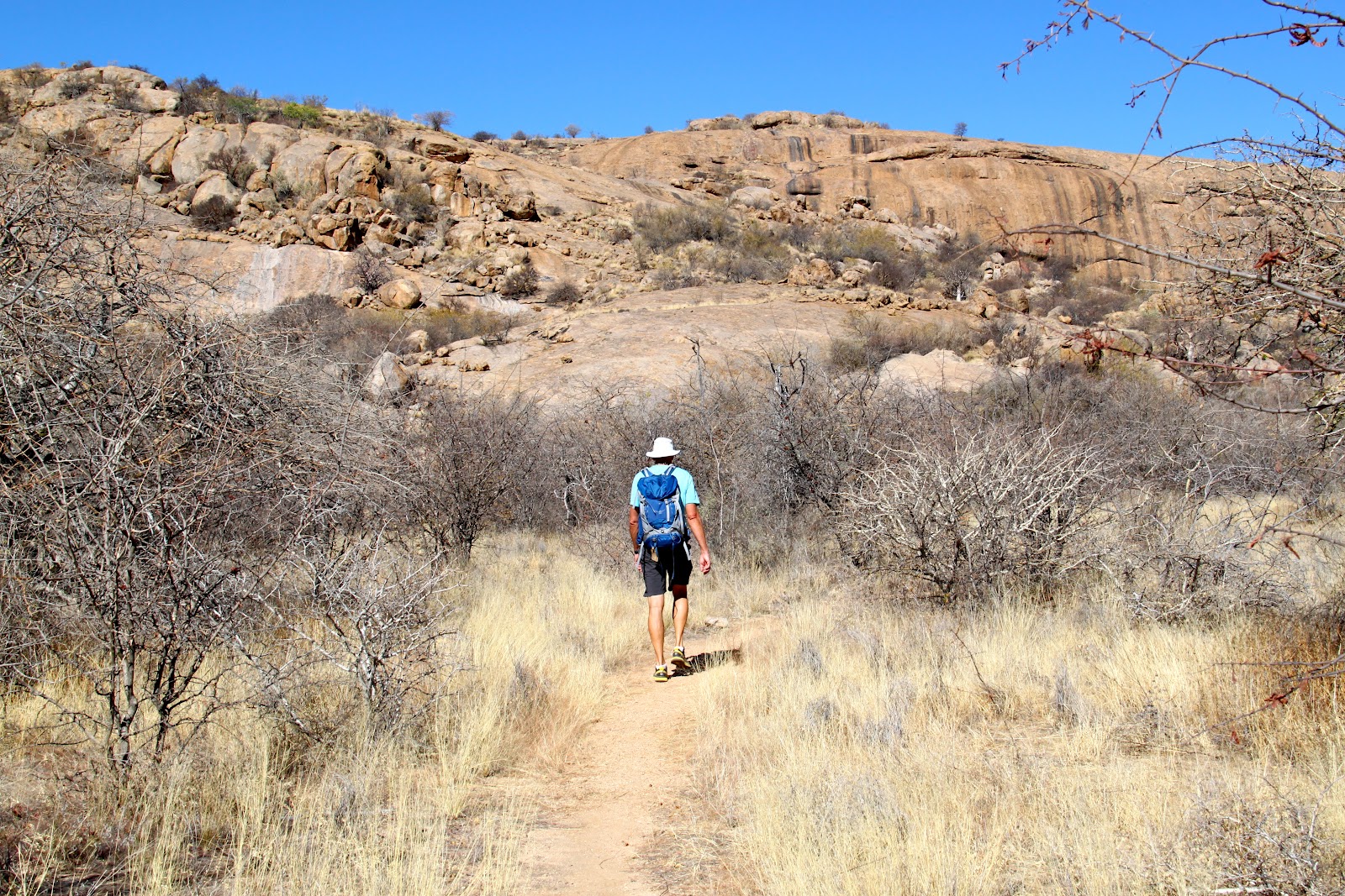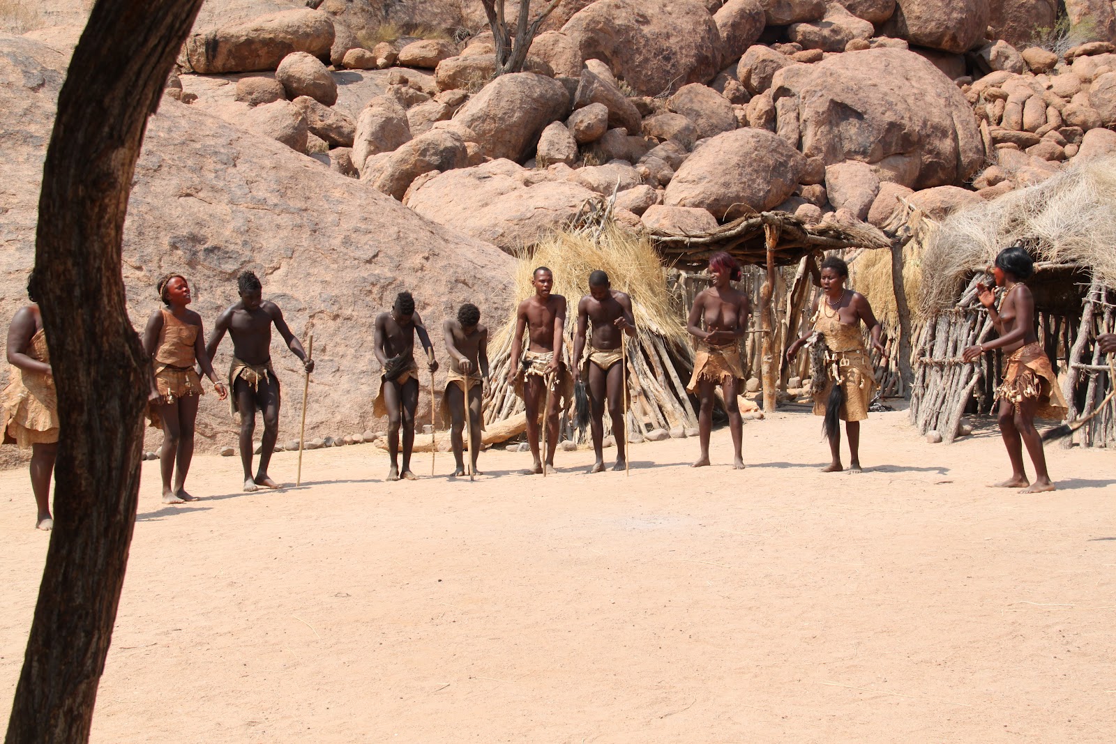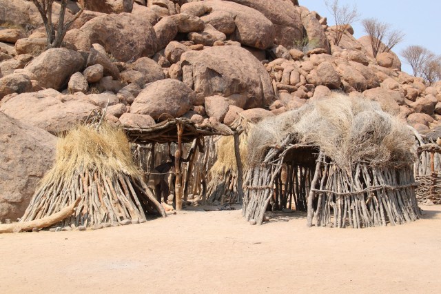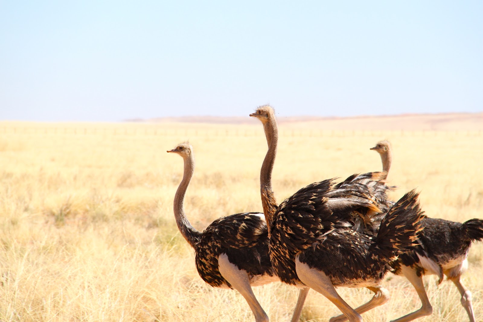 With a 6 am wake-up (a knock on your rock and thatched roof hut, as there are no phones or Internet), we are out to Etosha National Park. This morning we are going with a guide. Our guide drove 20 minutes to the park entrance and through the gate and immediately turned off the main road onto dirt roads. We noticed most vehicles were going a different direction. For the first hour there seems to be fewer animals than were outside our Ongava hut. But soon we saw 4 lazy lionesses. Then we saw springbok, oryx, and a solitary spotted hyena. It is very unusual to see a solitary hyena. They travel and hunt in packs. Then we saw springbok, male ostrich (their brains are smaller than one of their eyes) and herds of zebra, giraffe, wildebeest (a.k.a. gnu), kory bustard (a very large bird), a black faced impala (endemic to Namibia), kudu, hartebeest, warthog, and elephant. There are thousands of animals in Etosha. There are water holes in Etosha and animals migrate to the water.