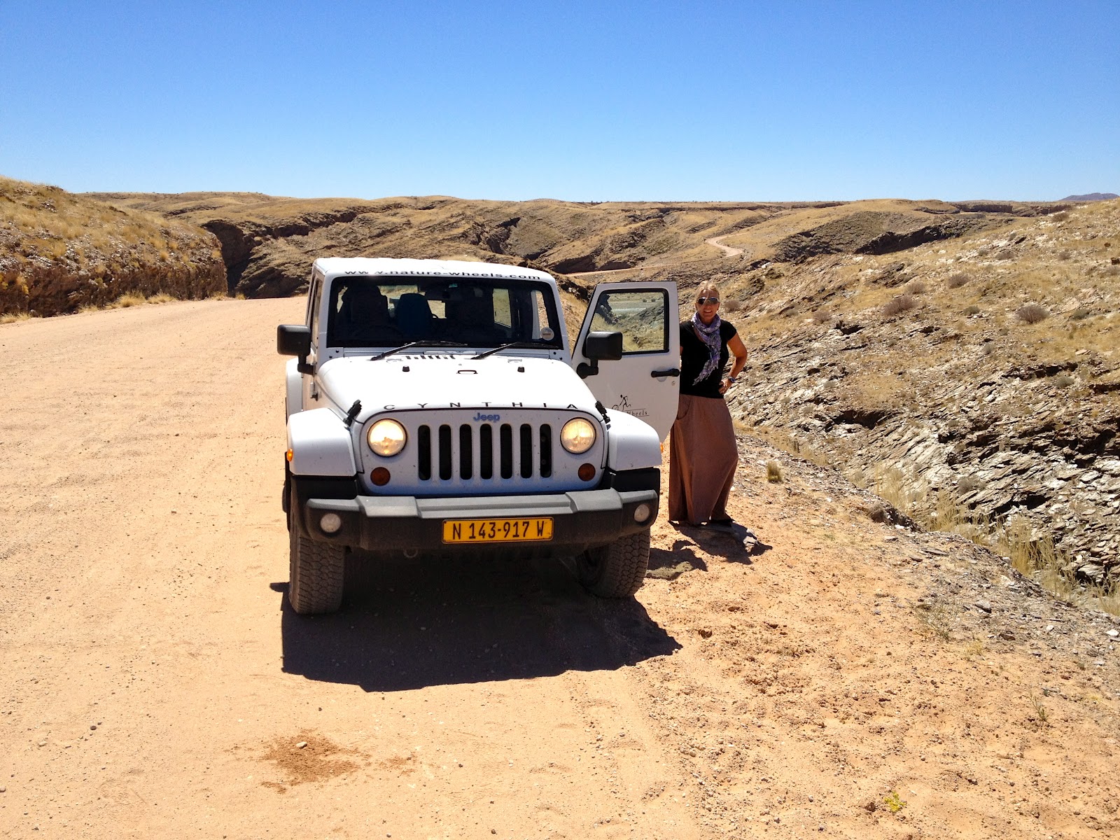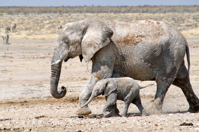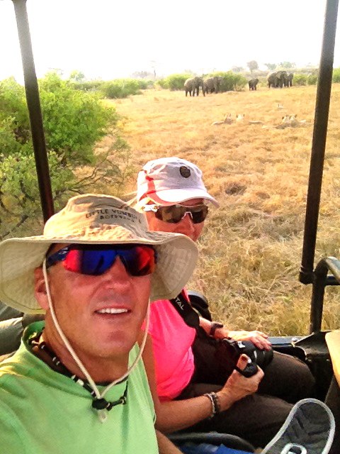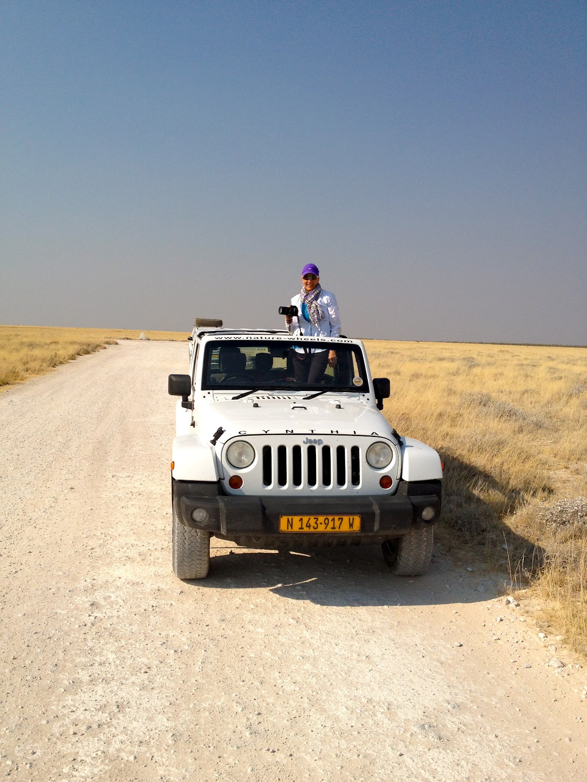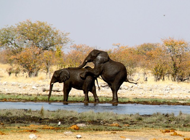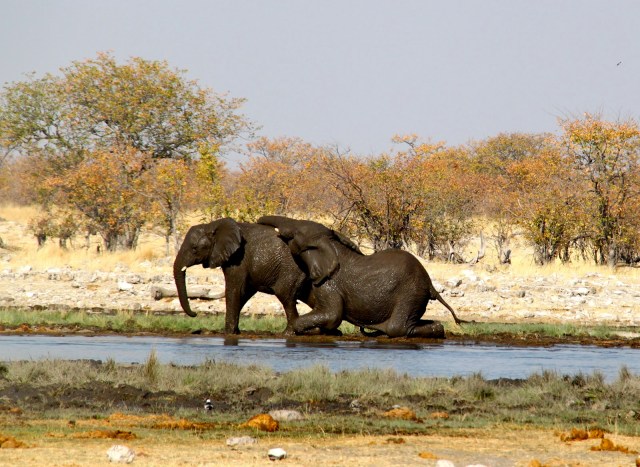 In the afternoon we drove back into Etosha in our Jeep without a guide. It is fun to go where we want and discover on our own. The top roof panels of our Jeep come off and we are able to stand on our seats and view animals and take photos. What fun! All roads are dirt, rock and rough. We found two more large herds of elephants in different areas of the park with 20 to 30 members each. We saw elephant mating behavior that was hysterical. The female seemed to be in charge and the male fell off her back and into the mud.