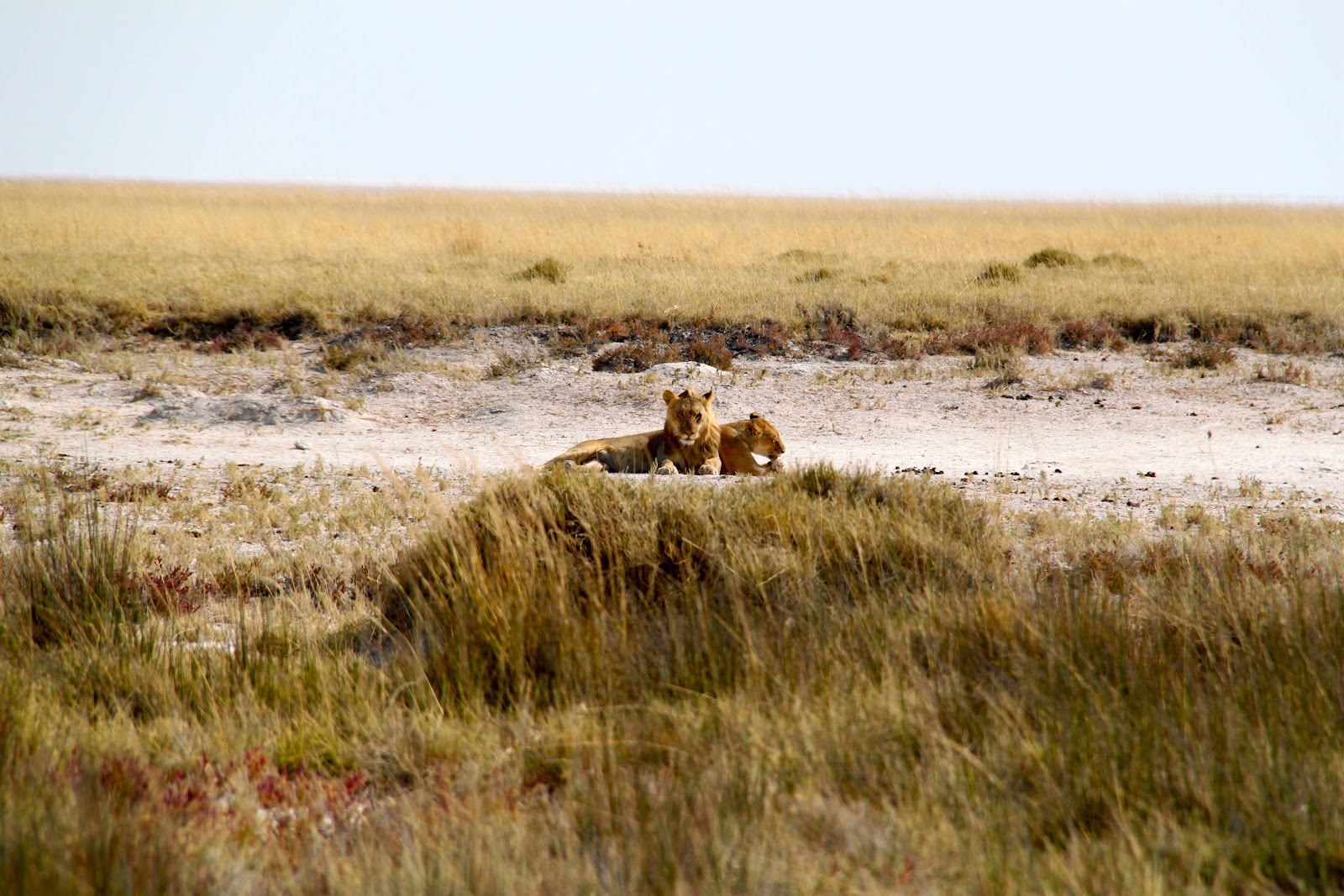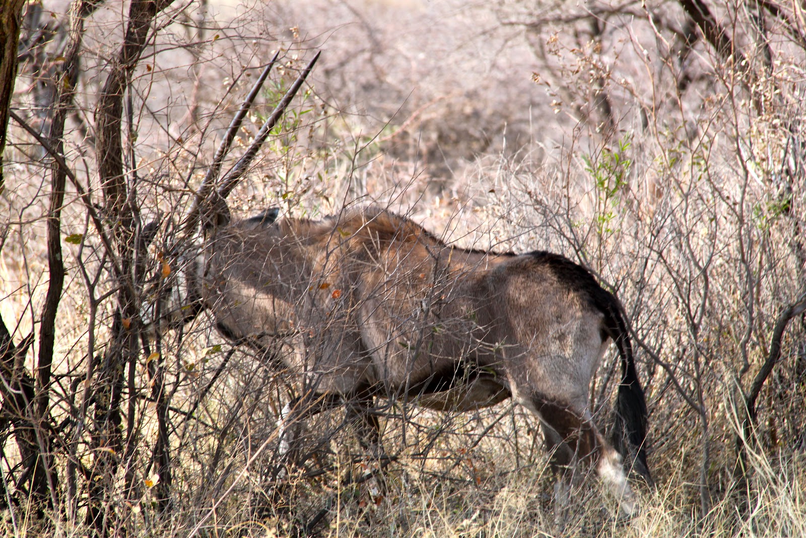 Another watering hole closer to the pan was our next “National Geographic” moment. We found 5 Lions-2 young males and 3 females. We went down the road for 5 minutes, and as we came back, we witnessed an amazing procession of animals, maybe a mile long, close to 1000 in number, coming over the rise. Wildebeest, Zebra, Antelope, and Oryx. They were all marching straight toward the Lions. We were sure we were going to see another Lion kill. The Lions hid in the grasses and behind mounds, waiting for prey, and soon the Wildebeest stopped in their tracks, and communicated with each other by snorting. The whole processional came to a stop. We waited for a while for the action, but the Lions are more patient than we are. We have to drive to our next Lodge 4 hours away. No doubt that the Lions did not go hungry.