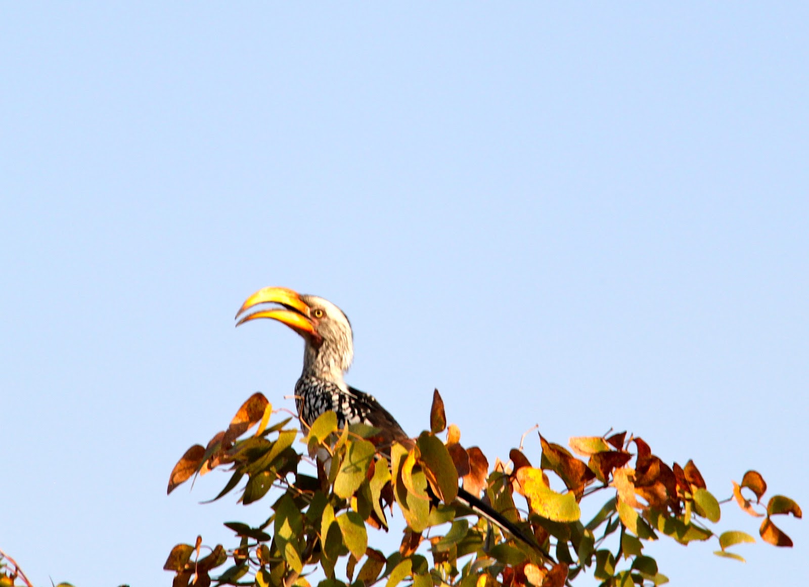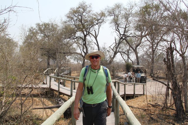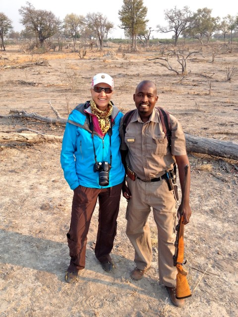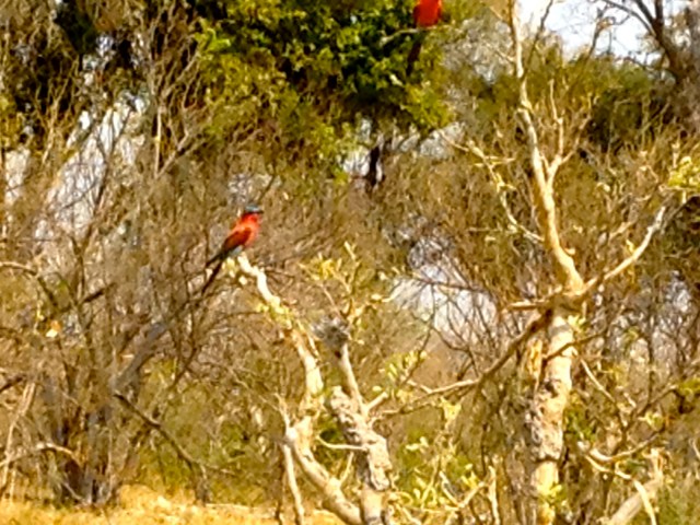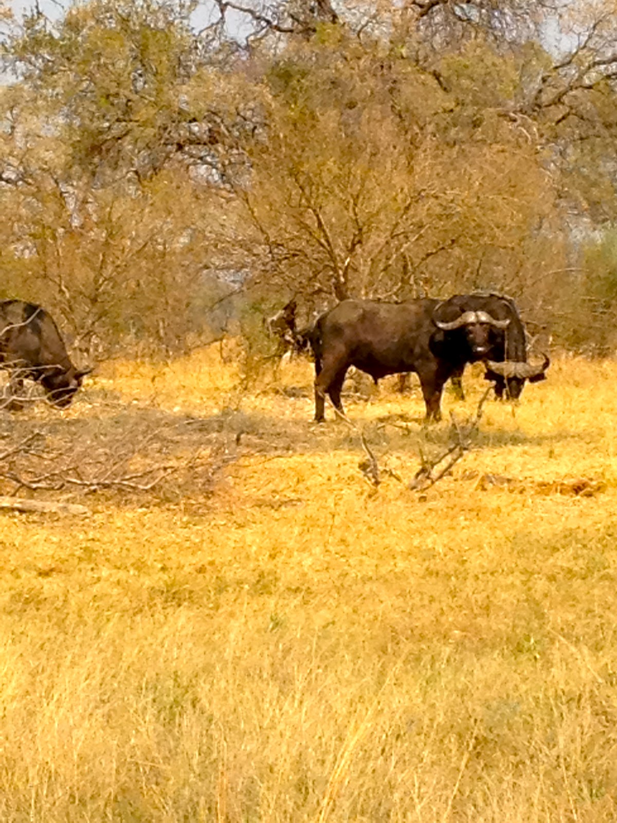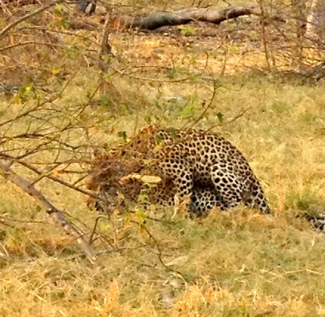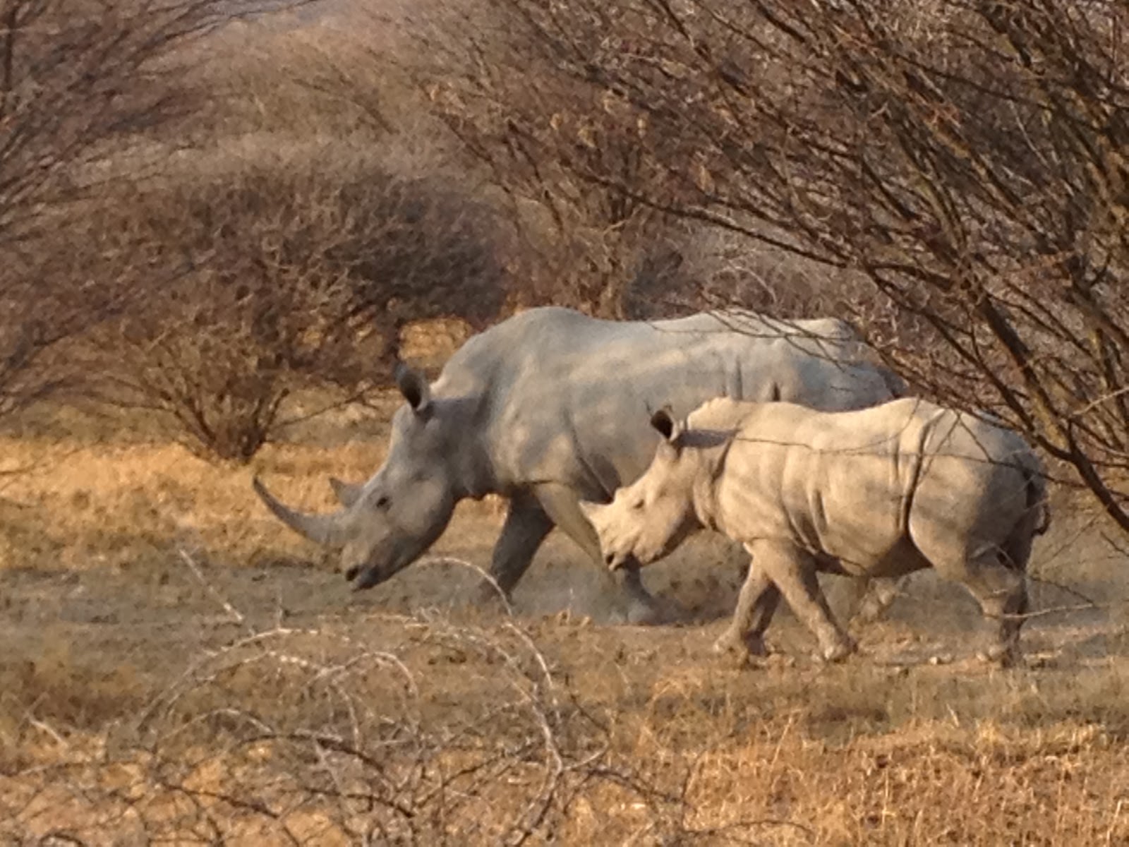 Ten minutes after leaving the lions we see white rhinos. It’s the same drill. The guide plows right through the bush scraping paint off the Land Rover in order to get as close as possible to the rhinos without endangering the rhinos or us. It is a big mama rhino and her baby. The baby is very intent on keeping very close to his mama. When mama starts to turn or walk the baby moves also and trots right below and close to mama. When mama stops the baby stops. These are beautiful animals and we wonder how their skin looks so good since they crash through the bush with reckless abandon smashing thorn bushes and small trees as they go.