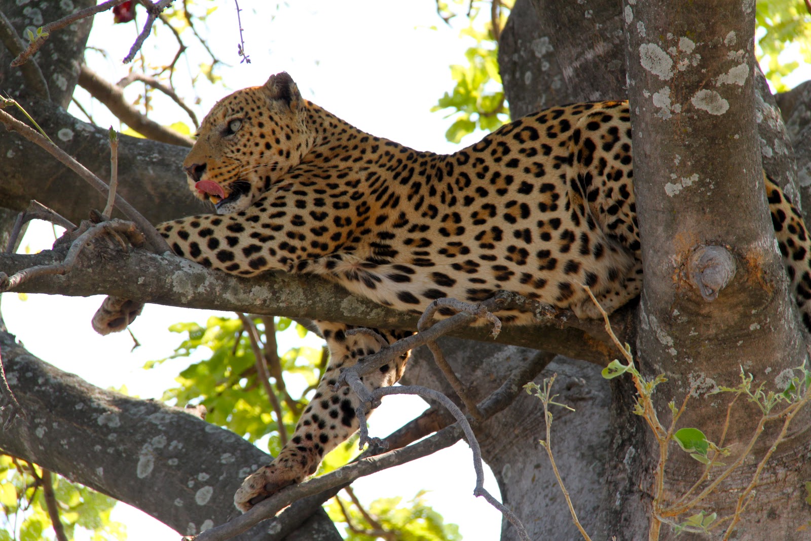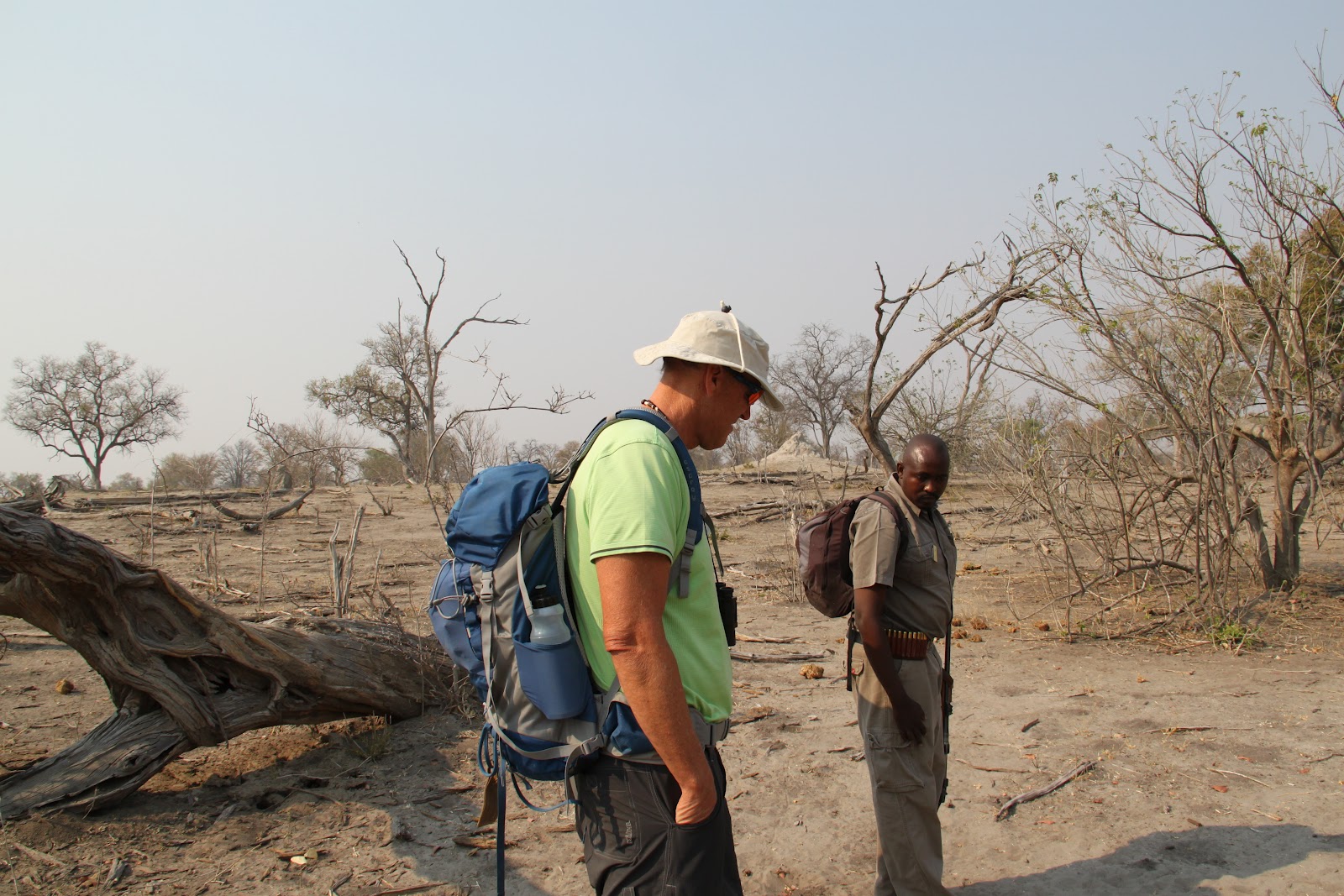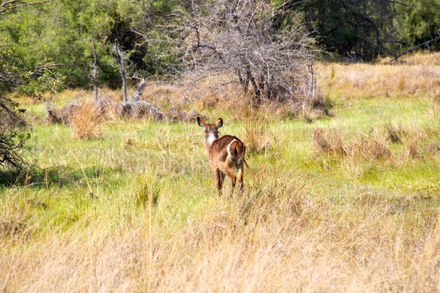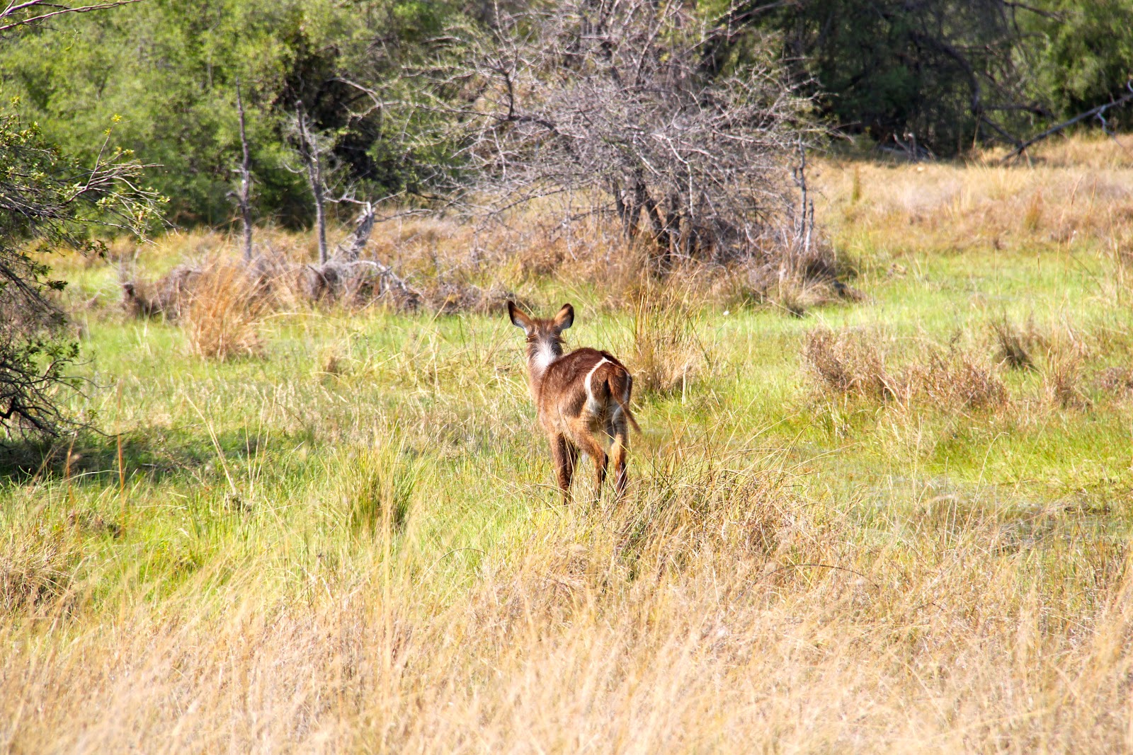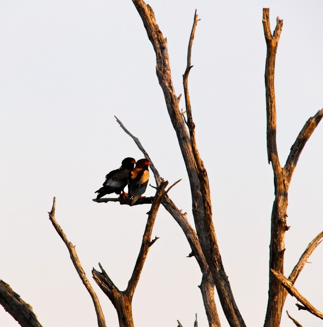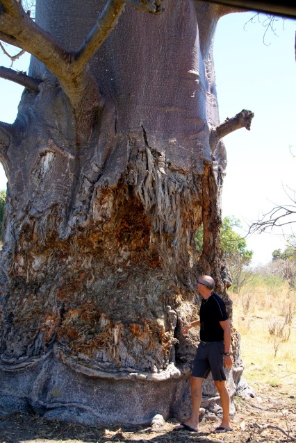 Ten minutes after leaving the lions we see white rhinos. It’s the same drill. The guide plows right through the bush scraping paint off the Land Rover in order to get as close as possible to the rhinos without endangering the rhinos or us. It is a big mama rhino and her baby. The baby is very intent on keeping very close to his mama. When mama starts to turn or walk the baby moves also and trots right below and close to mama. When mama stops the baby stops. These are beautiful animals and we wonder how their skin looks so good since they crash through the bush with reckless abandon smashing thorn bushes and small trees as they go.