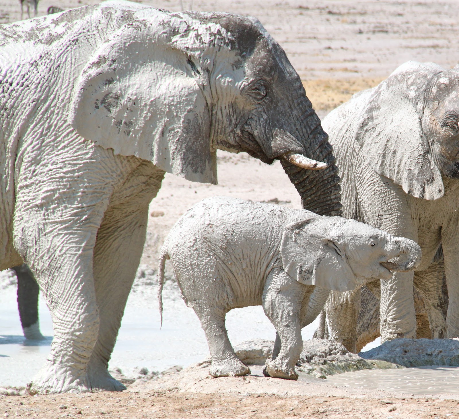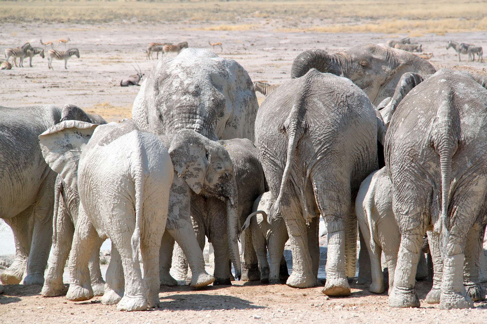 As we are approaching a water hole a huge bull elephant is walking away. The water hole is now crowded with animals. As we watched the animals some movement on the horizon caught our attention. In our binoculars we are just able to make out a few elephants. We then realize it is a big herd of elephants getting bigger and bigger in our view. Even the guide is getting excited. The elephants are kicking up dust and moving like a freight train to the water hole. The big bull had come first and moved on. Now the herd with mothers and babies of various sizes are about to arrive. As they are about to arrive their pace quickens and the tension at the water hole mounts. Babies were mixed in with and surrounded by the herd. The other animals begin jumping out of the water hole and moving out of the path of the advancing elephant herd. The herd moved directly into the water hole. Elephants would shake their heads and smaller animals would scatter. The elephants were now frolicking, drinking, and throwing mud on themselves. Elephants would charge any kudu or oryx who ventured too close to them. This was an elephant water hole now and the other animals circled or stood a safe distance away. After the elephants got out of the water they threw dirt and dust on themselves so they came in looking like dark elephants but left looking like white elephants.