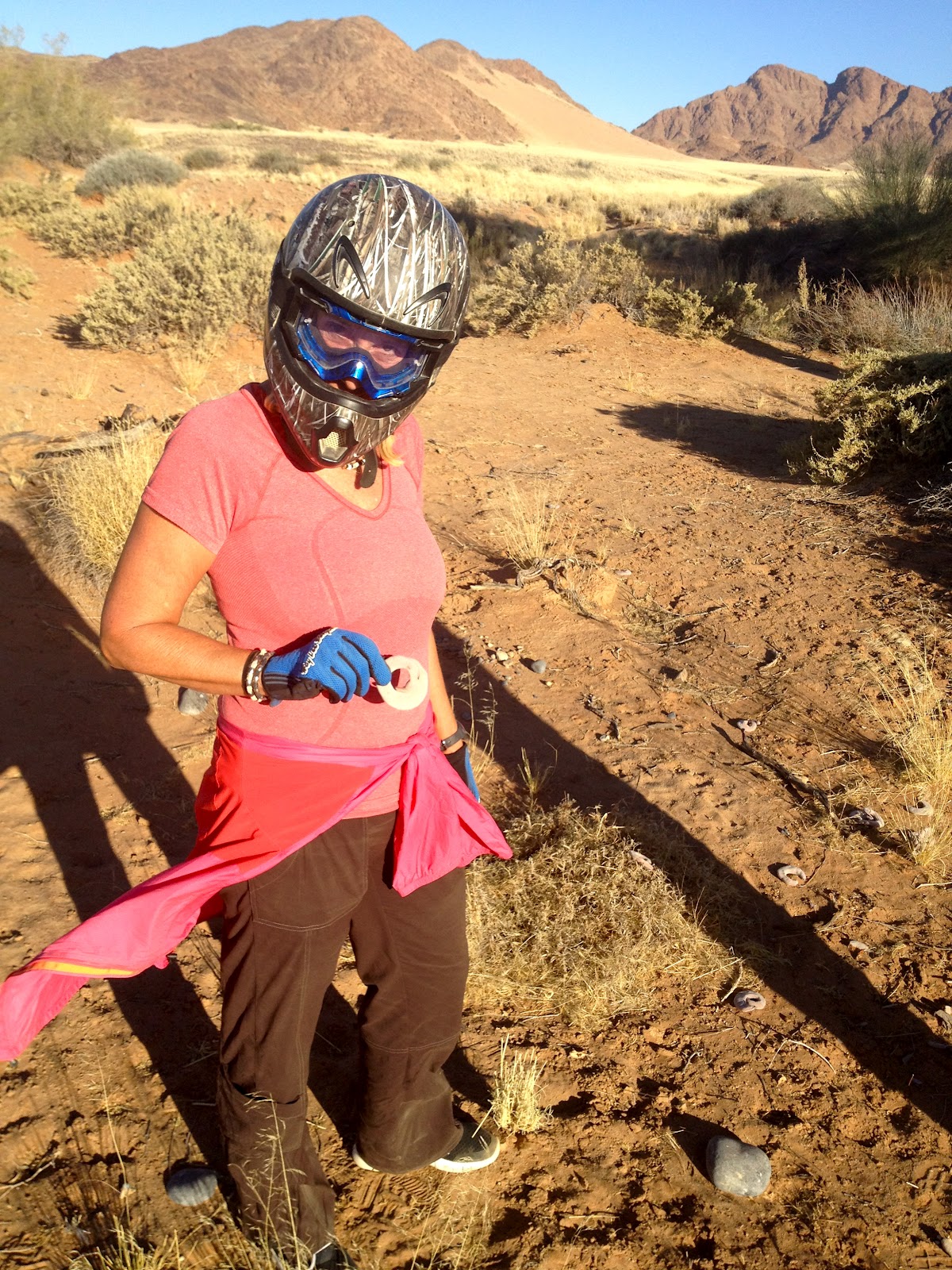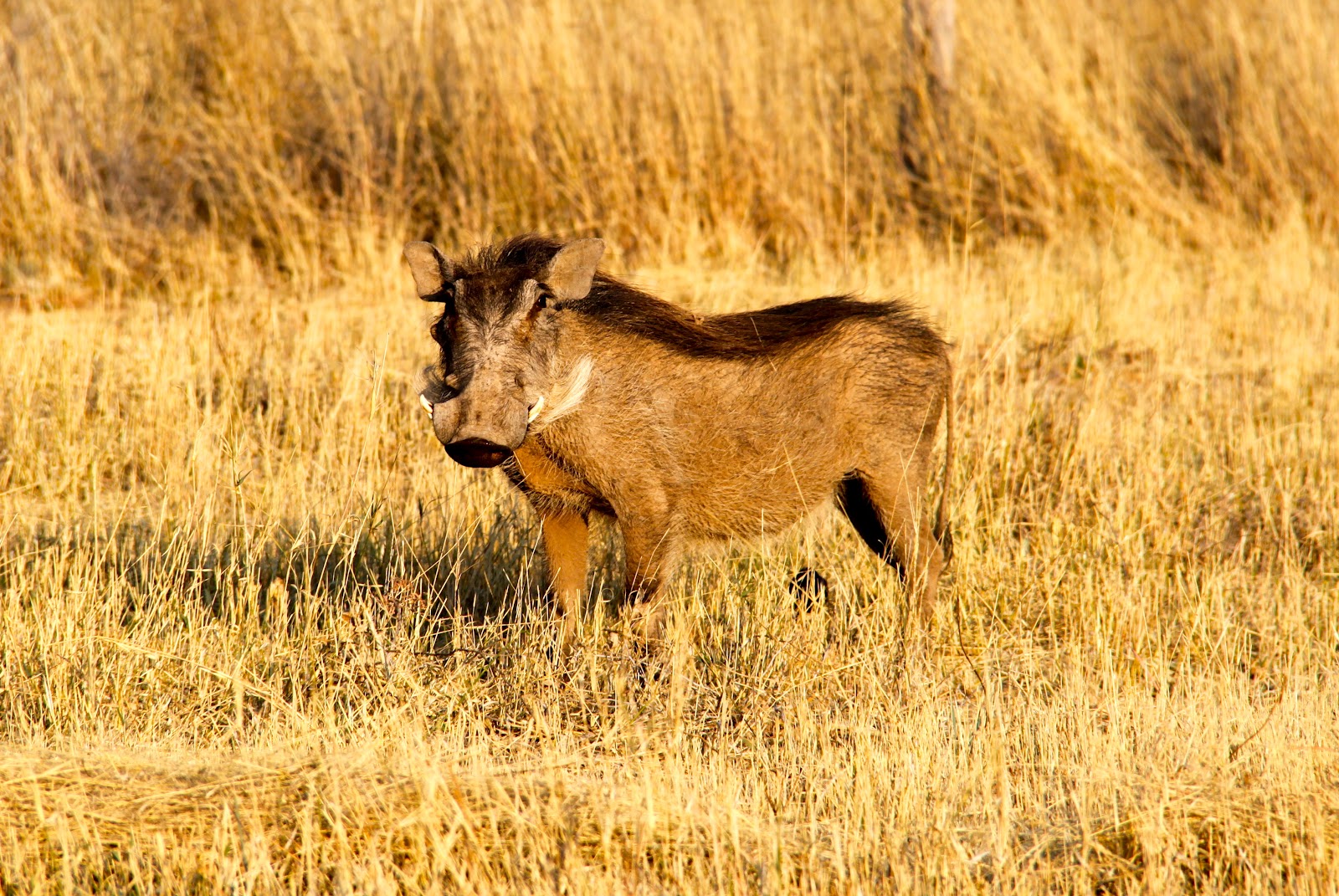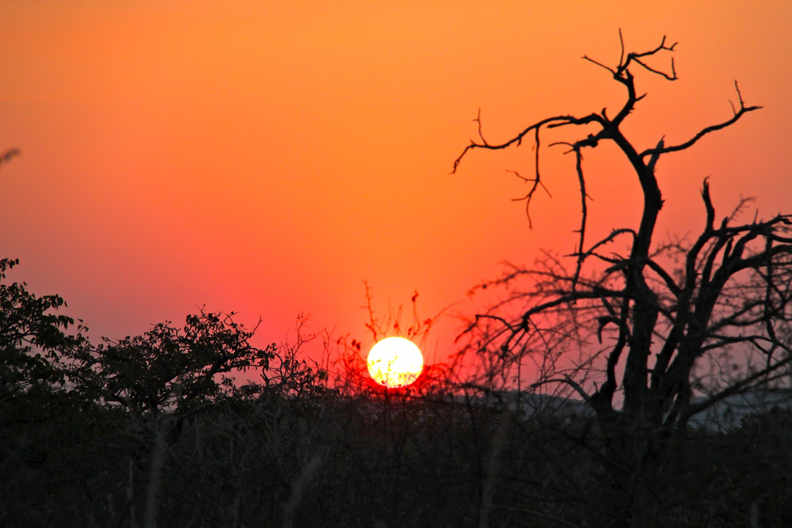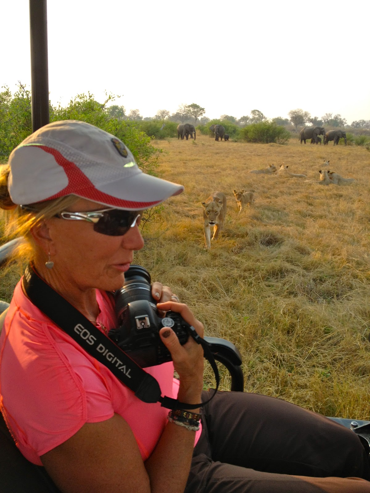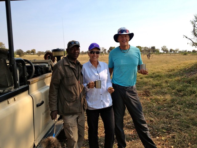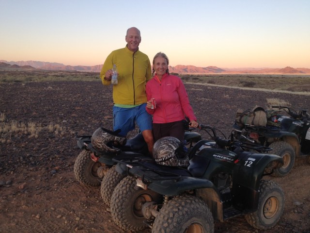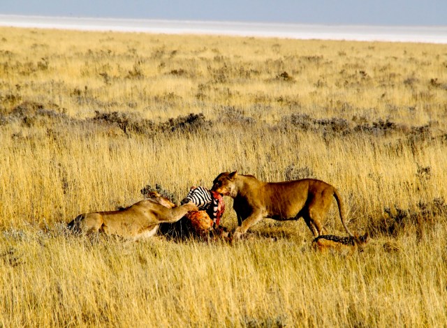 On the way out of the park we came upon four female lions eating a zebra. We did not see the kill but it must have just happened because the zebra was still kicking out at the lions so we know we just missed the take down. The lions faces were now becoming smeared red as they were exulting in their prey. After we watched the lions eat for a while we had to race to get back to the park gate by sundown to avoid being locked in the park. As we entered we were warned that we had to be out by sundown – no later than 6:48 pm. We just made it. Outside the park and on the way back to Ongava Lodge we parked our Jeep, got out on a dusty dirt road and watched the sun disappear behind the horizon while toasting “to warthogs!” with our water bottles. We are exhausted and happy.