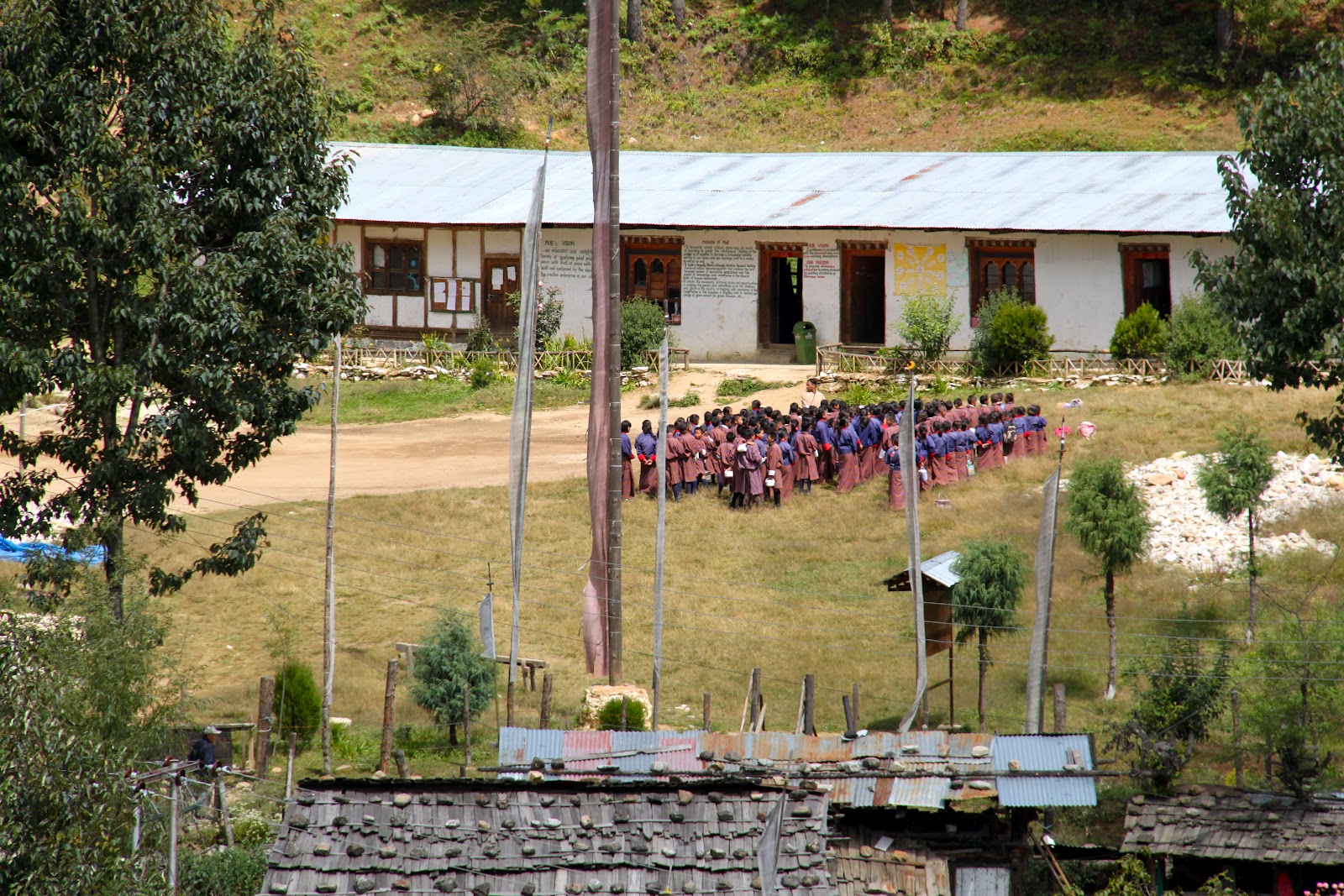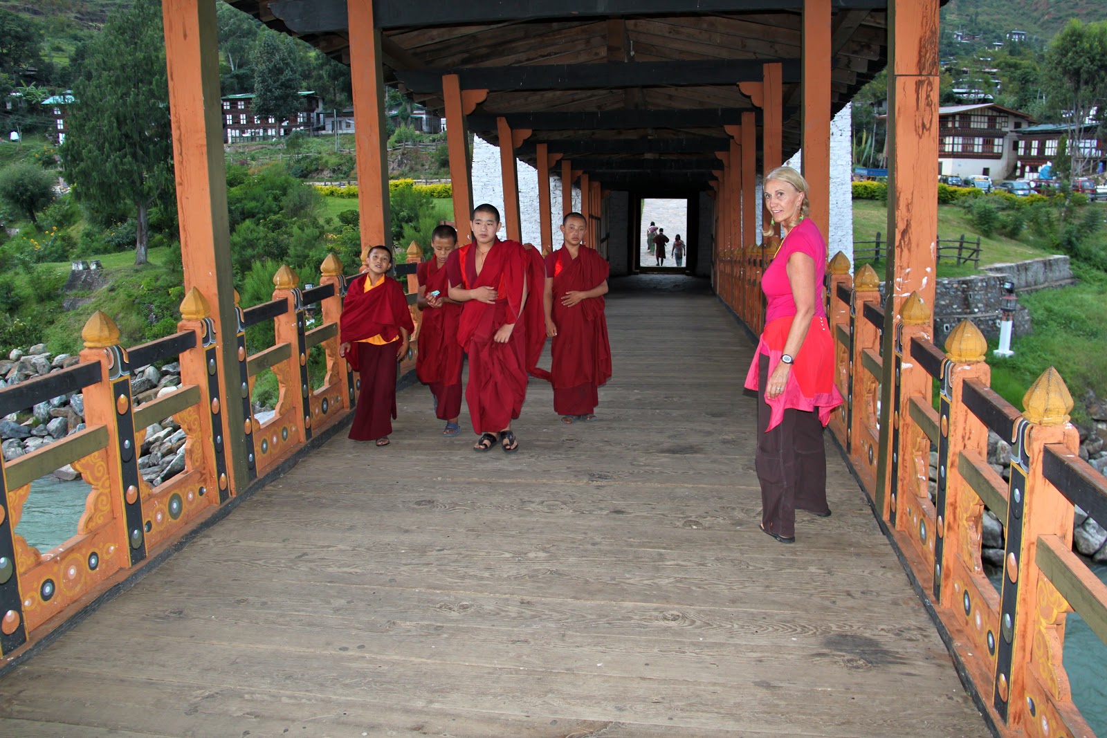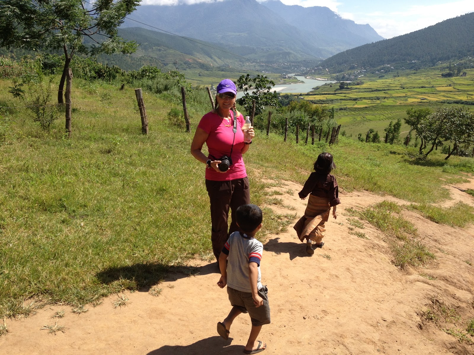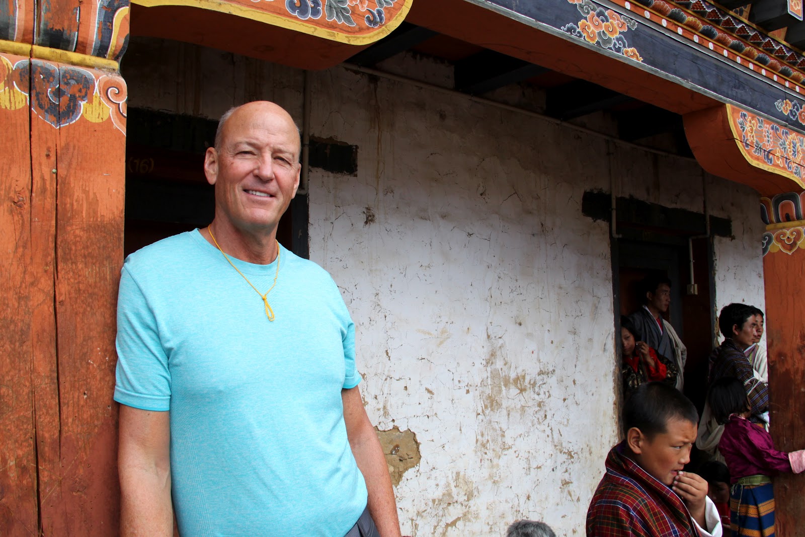 Bhutan separates religious matters and matters of state but the state dictates that the people must wear the traditional dress of ancient Bhutan everyday except for Sunday. The men wear a Gho dress and the women wear a Kira dress. I don’t sense that anyone has a problem wearing the traditional dress. All the people are friendly and children are curious and will speak a few English words. English is required study in school. School is compulsory.