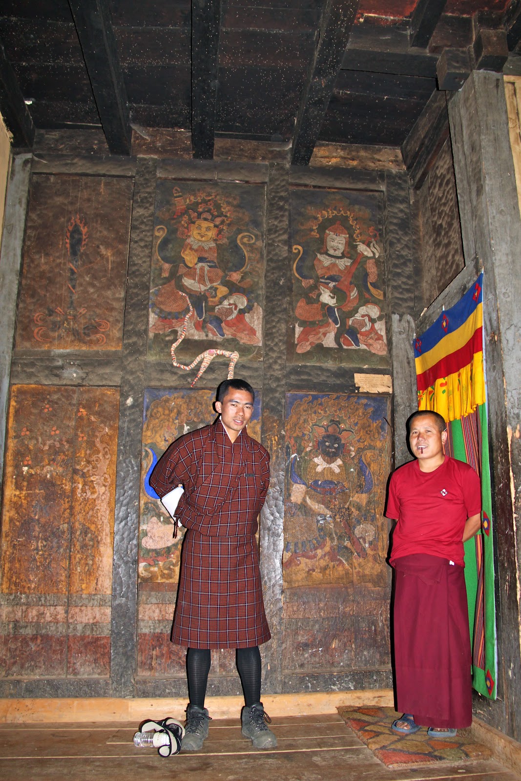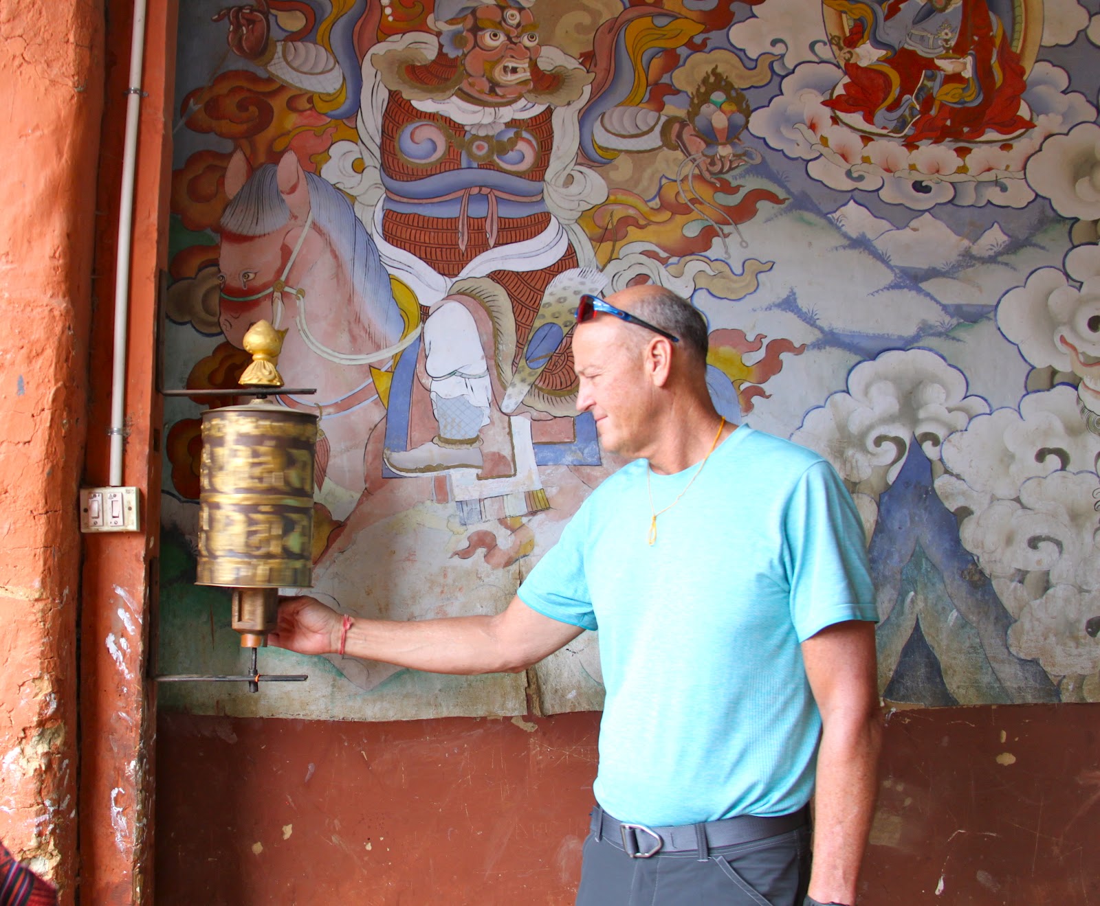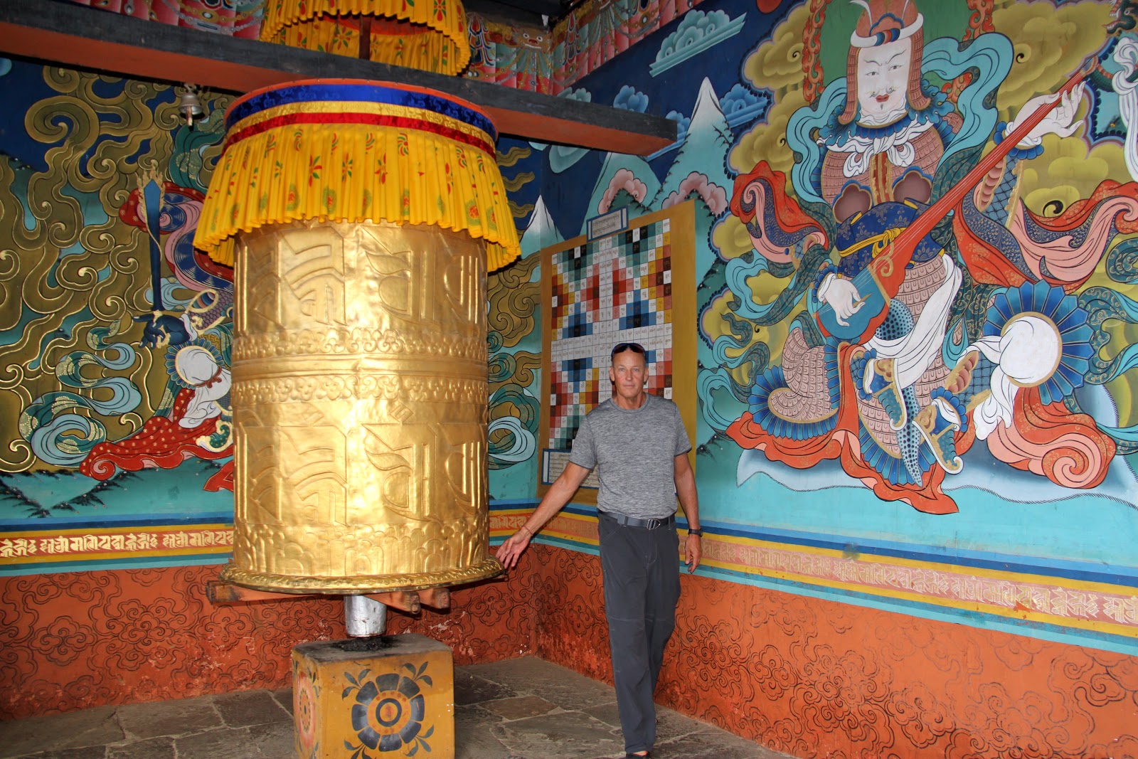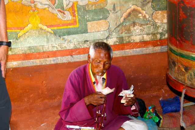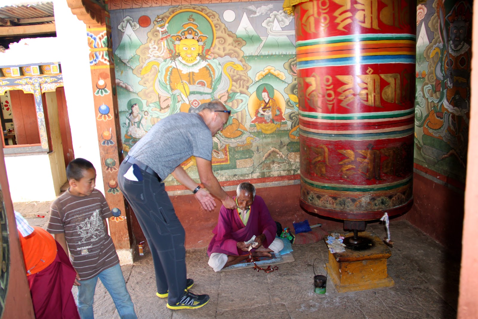 You must cover your shoulders and legs and must remove your shoes before entering a temple. No shorts are allowed and you might need a collared shirt to get into some of the temples. You are not allowed to take photos inside of temples. We follow Tashi and spin the prayer wheels as we enter the temple. Once inside we try to follow Tashi’s lead and we show respect by using hands clasped in front in prayer position and follow Tashi as he touches his hands multiple points on chest and head and then kneels and touches his forehead to the ground. The statue of the Buddha in front of us must be 15 feet tall and covered in gold. We follow Tashi’s lead and make small cash offer and the monk pours holy water into our hands. Tashi sips the holy water from his hands (we don’t) and sprinkles the rest over his head.