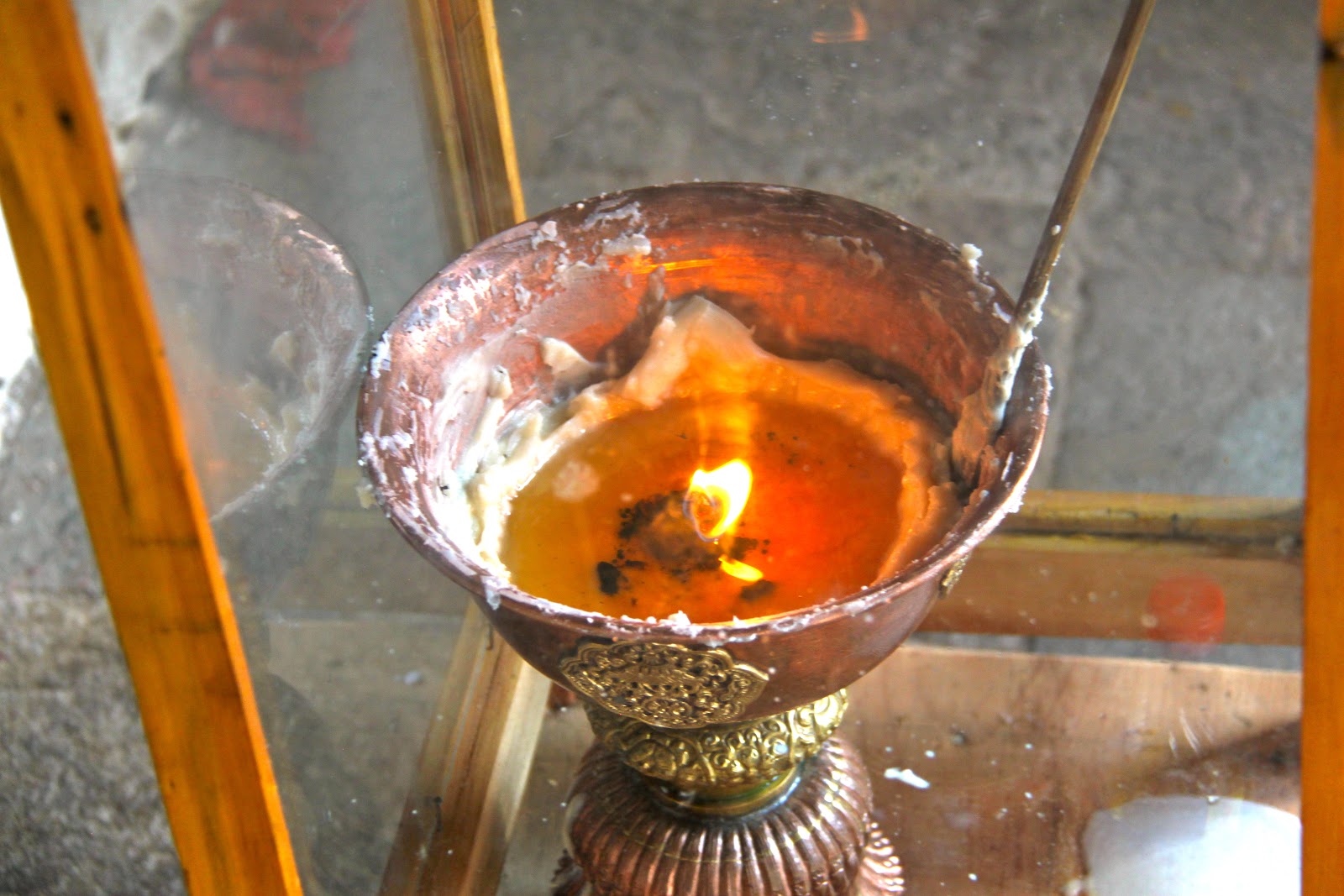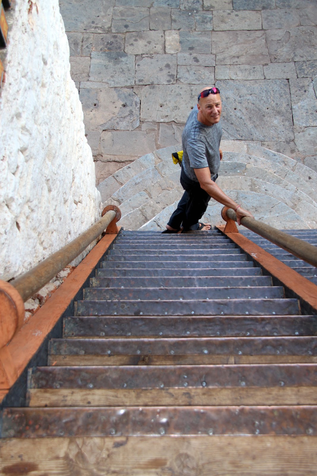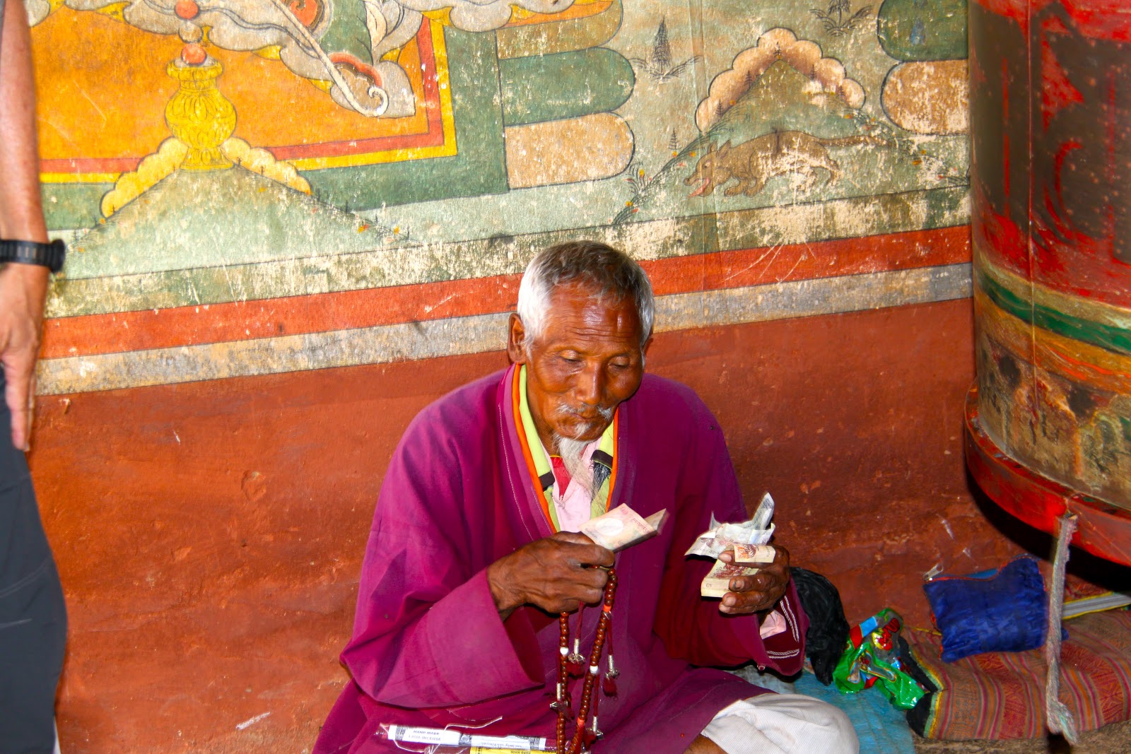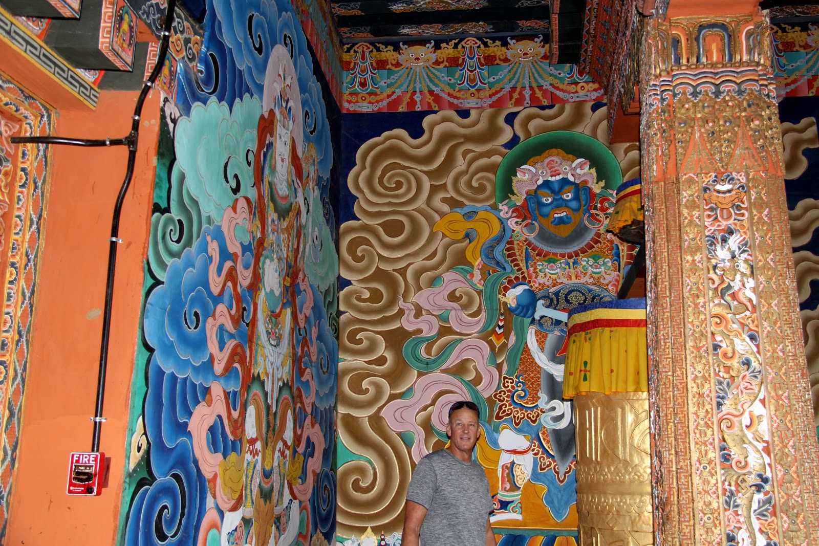 You must cover your shoulders and legs and must remove your shoes before entering a temple. No shorts are allowed and you might need a collared shirt to get into some of the temples. You are not allowed to take photos inside of temples. We follow Tashi and spin the prayer wheels as we enter the temple. Once inside we try to follow Tashi’s lead and we show respect by using hands clasped in front in prayer position and follow Tashi as he touches his hands multiple points on chest and head and then kneels and touches his forehead to the ground. The statue of the Buddha in front of us must be 15 feet tall and covered in gold. We follow Tashi’s lead and make small cash offer and the monk pours holy water into our hands. Tashi sips the holy water from his hands (we don’t) and sprinkles the rest over his head.