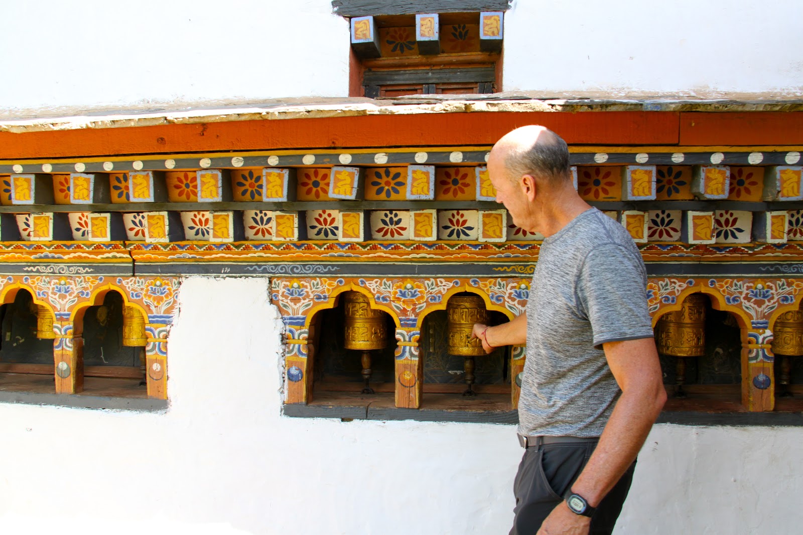 We spin the prayer wheels in a clockwise motion in order to send prayers to heaven.