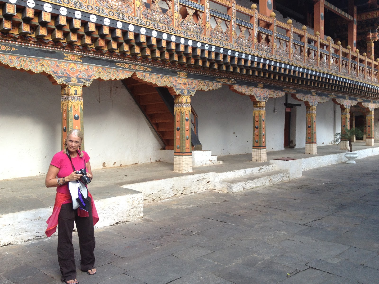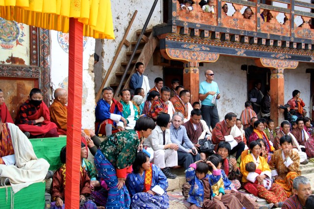 Far below we can see the Tashichhodzong courtyard where the festival is still going on. The festival lasts from about 9 am to 5 pm. We can hear some of the sounds of the drumbeats and cymbals.